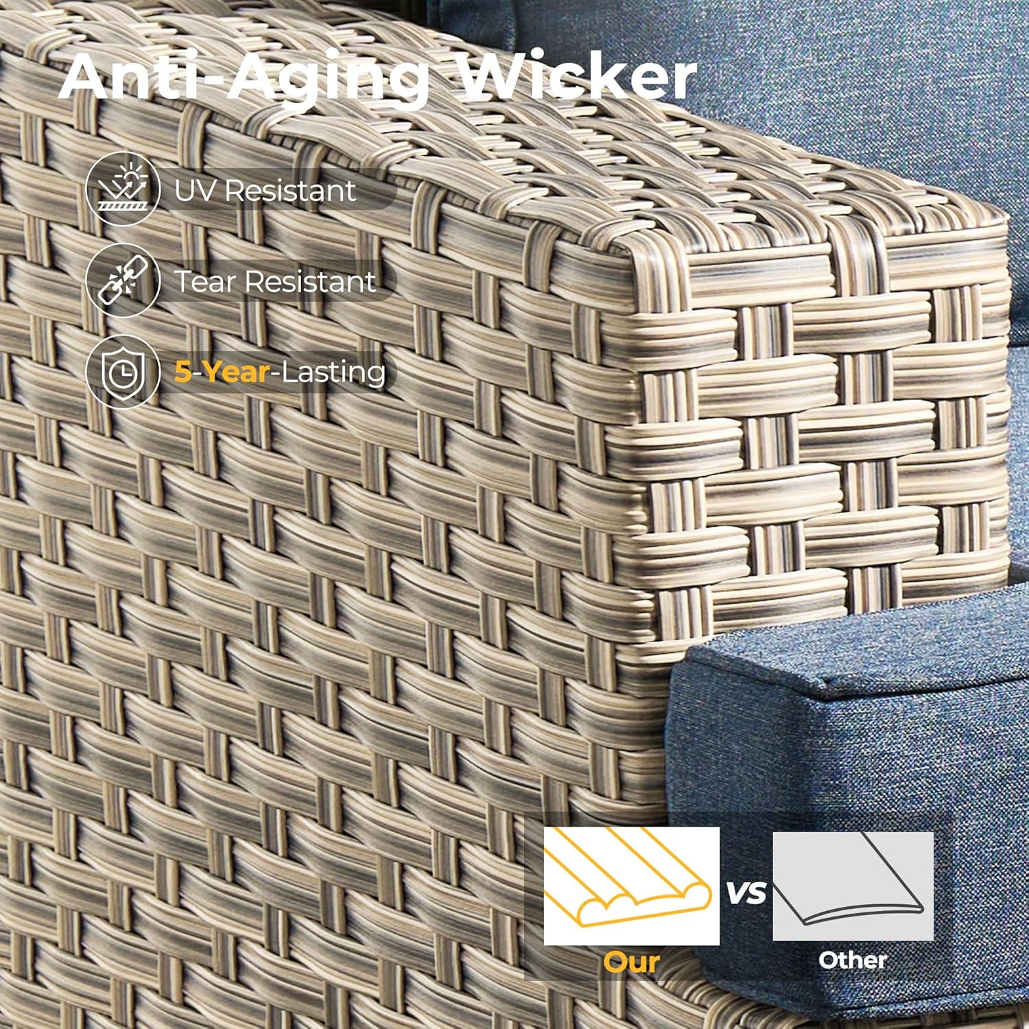 - All Weather & Durable: Selected anti-ageing treated thicken PE wicker rattan for UV resistant, wear resistant and all weatherproof. 3D strengthen and widen design for extended service life,twice service life as others