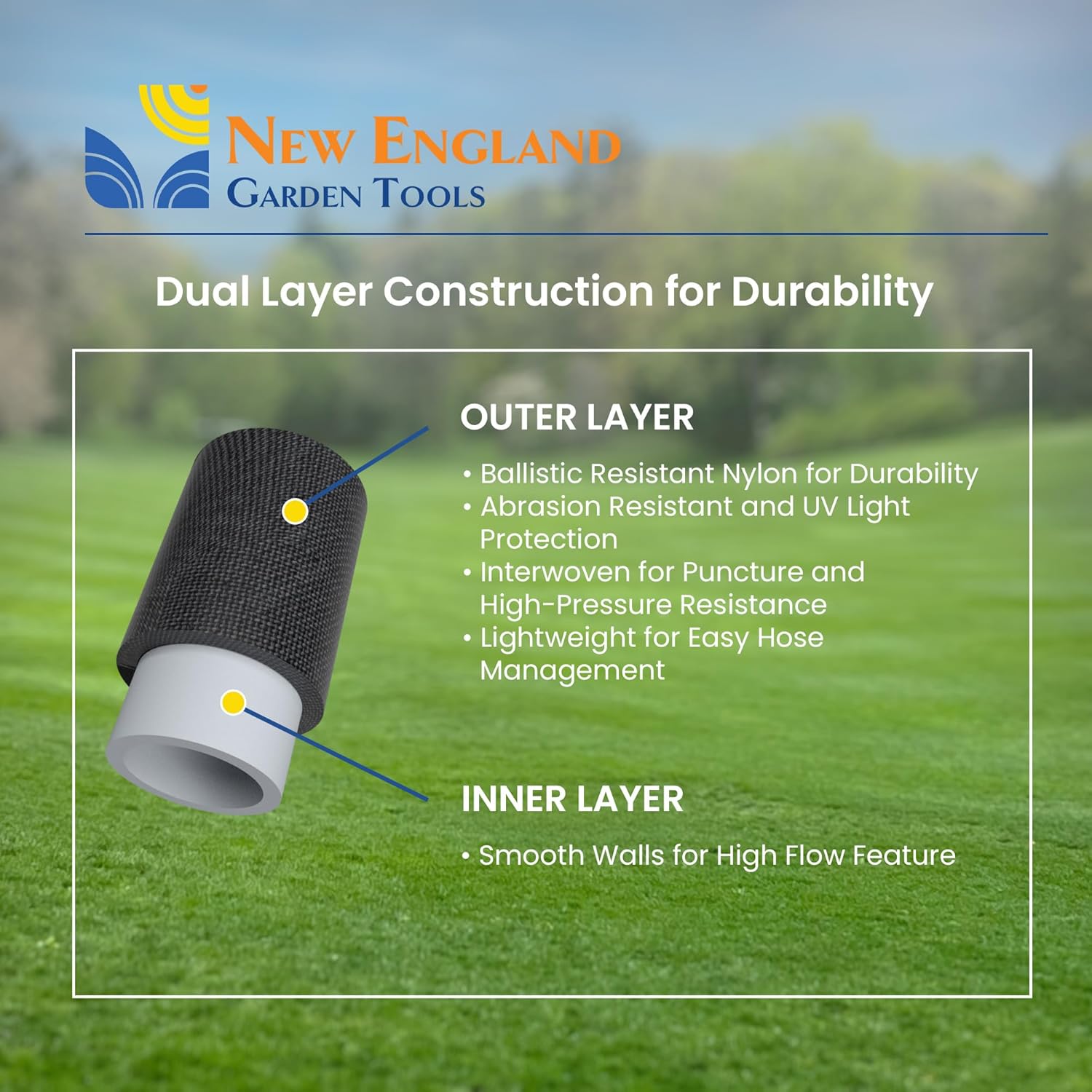 Flat Garden Hose (100 foot x 5/8 inch) Lightweight, Durable Fiber Jacket, Flexible & Kink Free, Non-Expandable Water Hose, Easy Handling in All-Weather Conditions, 700010 by New England Garden Tools