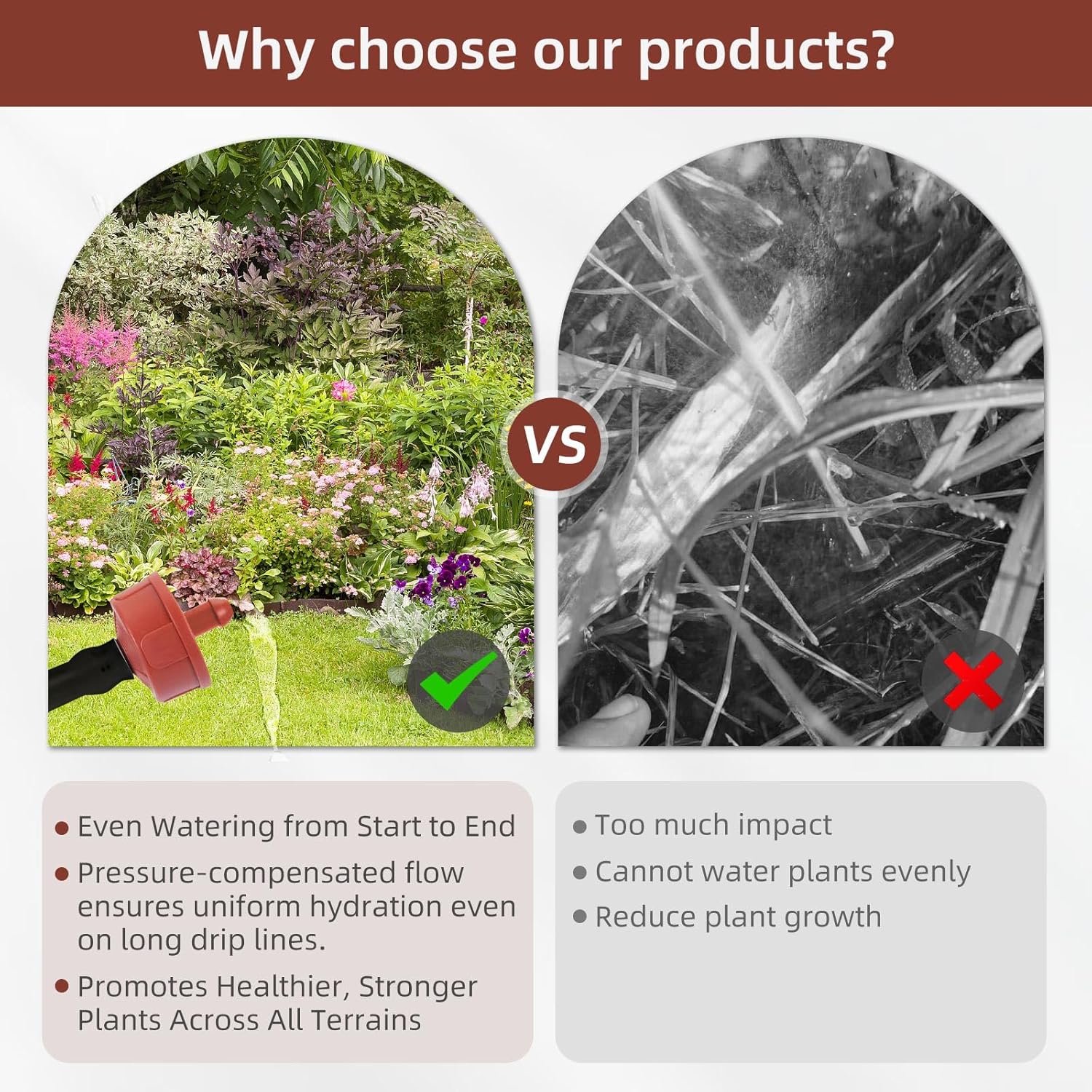 - Pressure Compensating Technology: Our pressure compensating irrigation spot drippers/emitters maintain a constant, steady 2 Gallon Per Hour(8L/H) water flow at 10-60 PSI. Whether on slopes, long lines, or uneven terrain, your plants will get the precise amount of water they need without the hassle of over- or under-watering. NOTE: Flow may appear fast, but the outlet is smaller than 1/4" tubing—ensuring true 2 GPH delivery. (NOTE: Fast-looking flow is visual; actual output is precisely 2 GPH.)