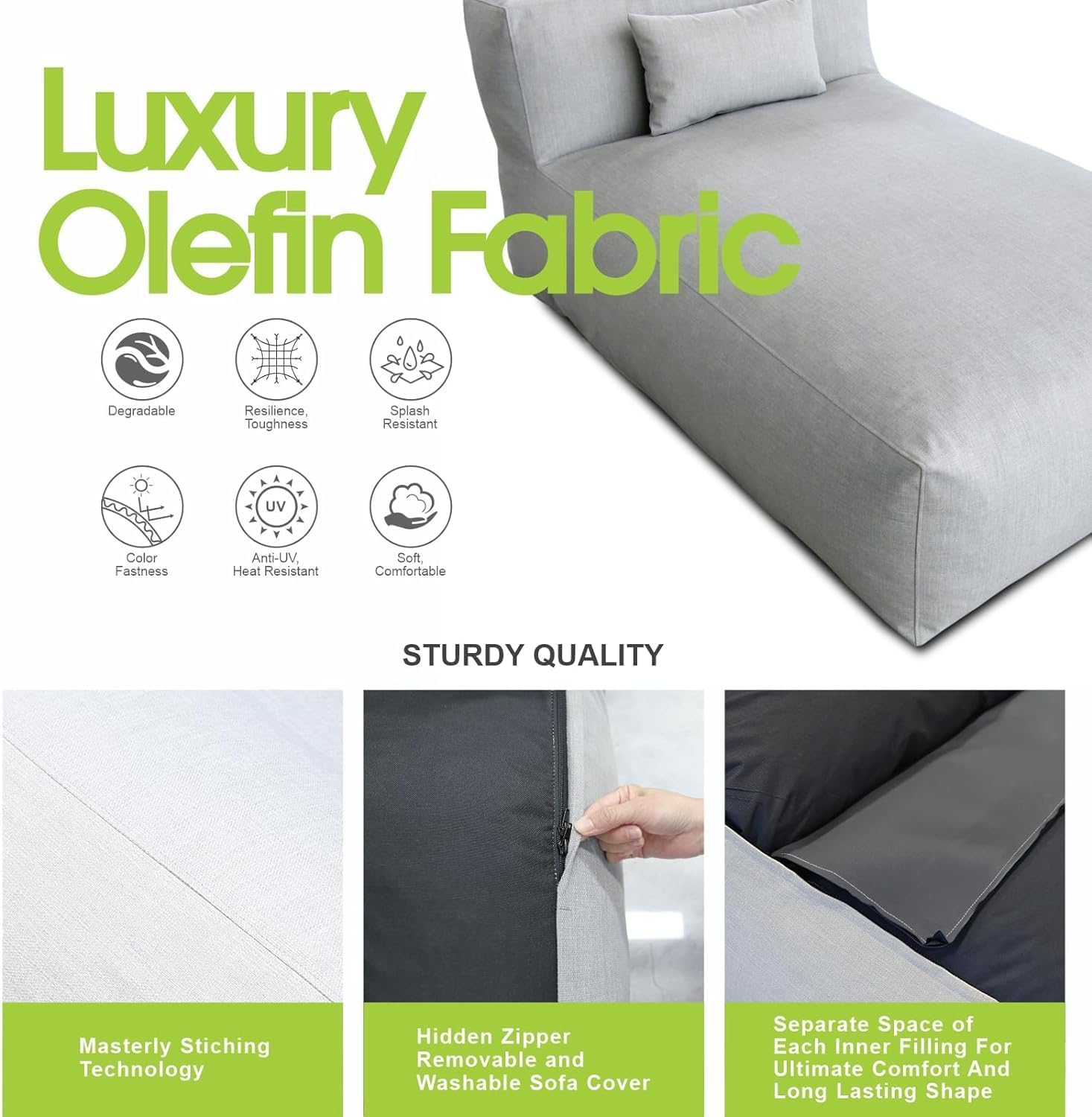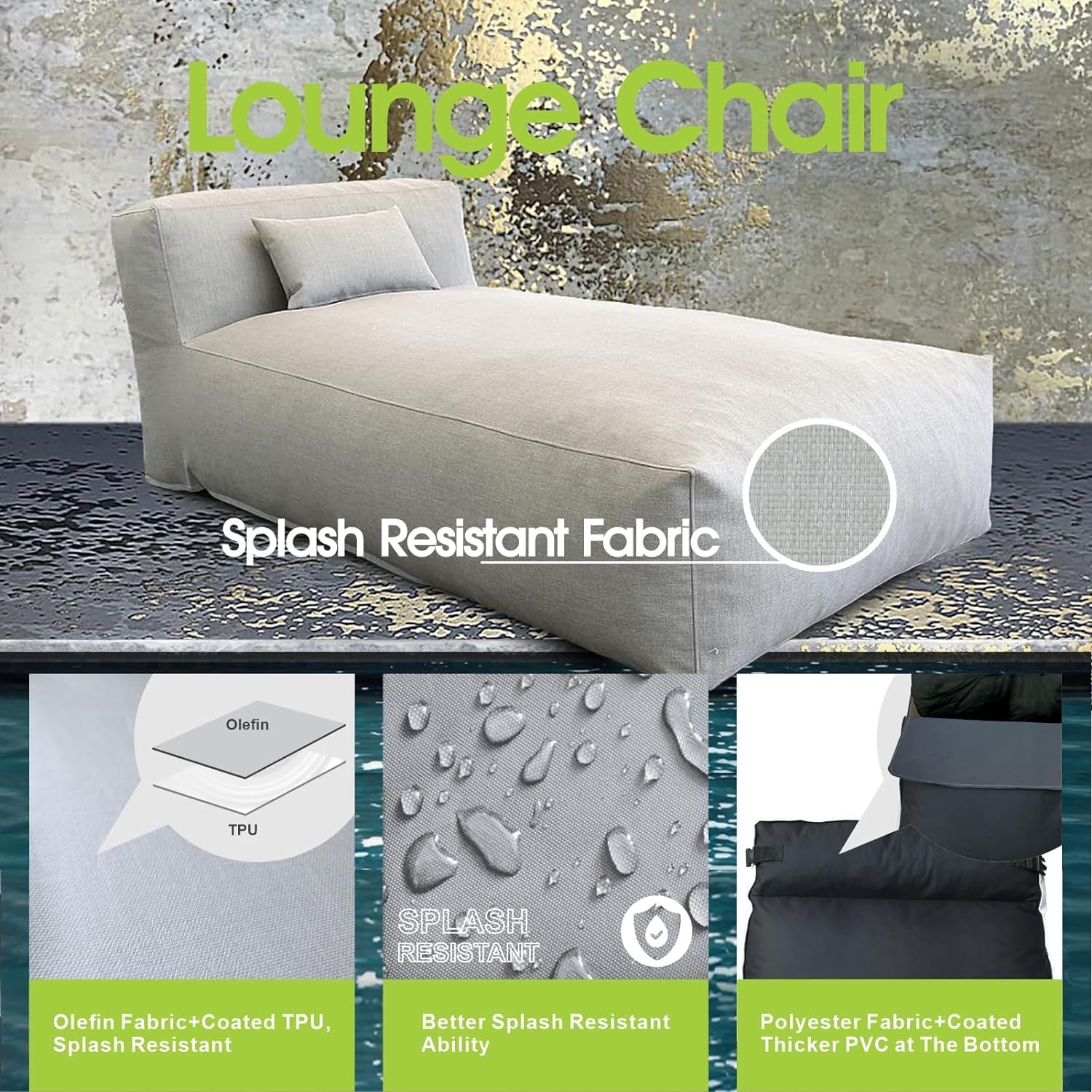 - Premium Olefin Fabric – Water Repellent, UV Resistant, and Durable - Made with high-performance olefin fabric, this lounger resists splashes, fading, and UV rays while remaining breathable and soft. Olefin is known for its color fastness, heat resistance, and eco-friendliness, making it the ideal material for outdoor lounge furniture that looks good and holds up season after season.