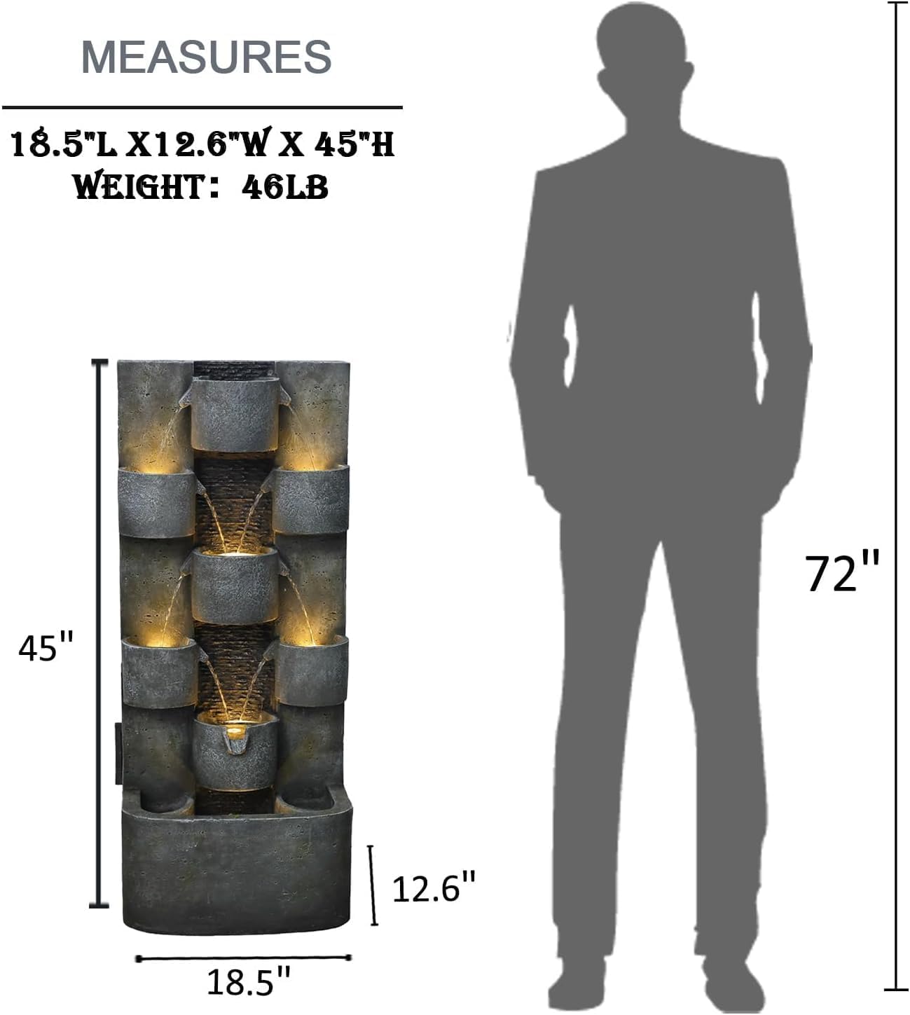 - SIZE AND ACCESSORIES - The size of the patio fountain is 18.5"L x 16.2"W x 45"H.To Fit Any Outdoor Area.9.8 ft Power Cord(Extended power cord solves your space problems).Accessories Include: Garden Fountain*1,Artificial plants,Transformer*1,Pump*1,Pebbles*1,Detailed Instructions*1.