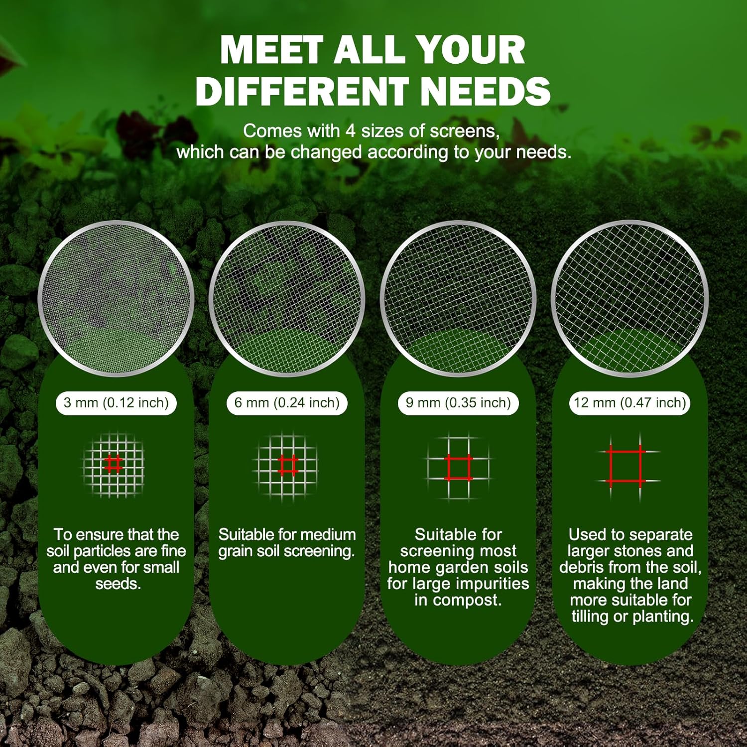 - Our soil sifter for gardening contains 4 removable compost sifter sizes (0.12/0.24/0.35/0.47in): 0.12 Inch: fine soil, suitable for small seeds, houseplants. 0.24 Inch: medium grain, suitable for vegetables (e.g. tomatoes, eggplants). 0.35 Inch: for home garden soil, suitable for ornamental plants (e.g. roses). 0.47 Inch: Provides good permeability, suitable for fruit tree planting