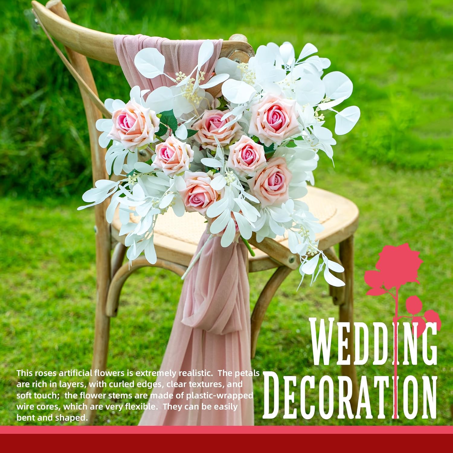 - Realistic Details of Silk Roses:Our silk roses, as high-quality artificial flowers, are extremely realistic. Their petals are rich in layers, with curled edges, clear textures and soft touch. The stems are made of plastic-wrapped metal cores, which are highly flexible and can be easily bent and shaped. The color transition of the stems is natural, with subtle concave and convex textures and moderate hardness, making them excellent realistic artificial flowers.