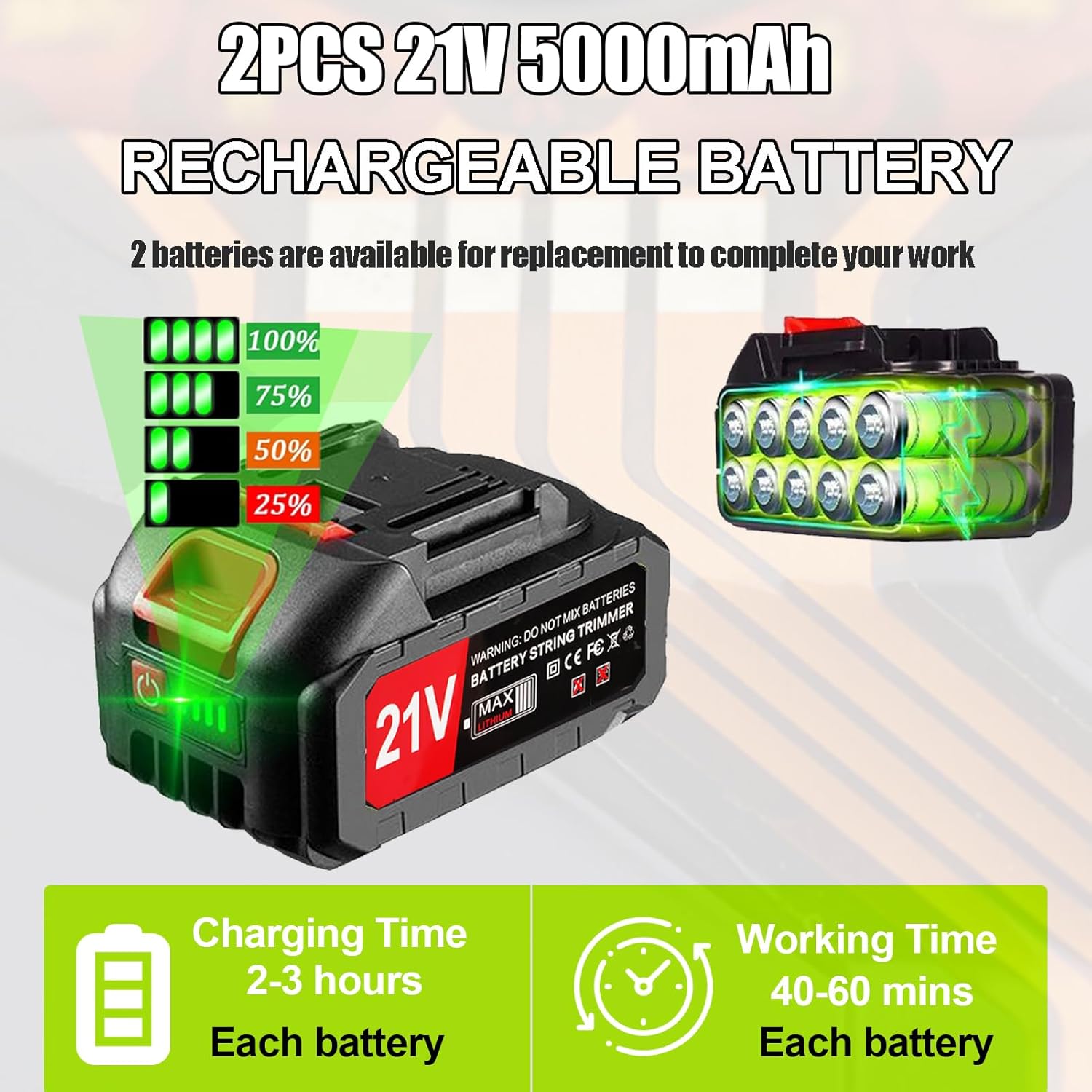 - TIP1: Please fully charge the battery when using the electric weed wacker for the first time. Charging before it runs out to extend the service life. Please unload the battery immediately after use to keep the power off
