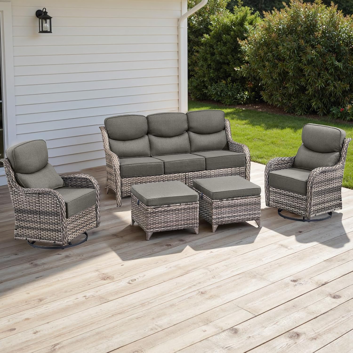 Wicker Outdoor Patio Furniture Set - 5 Piece Patio Conversation Sets with Swivel Rocker Chairs, Ottomans and Sofa, 6 inch Cushions, Waterproof Wicker, for Porch Deck Mixed Grey/Grey