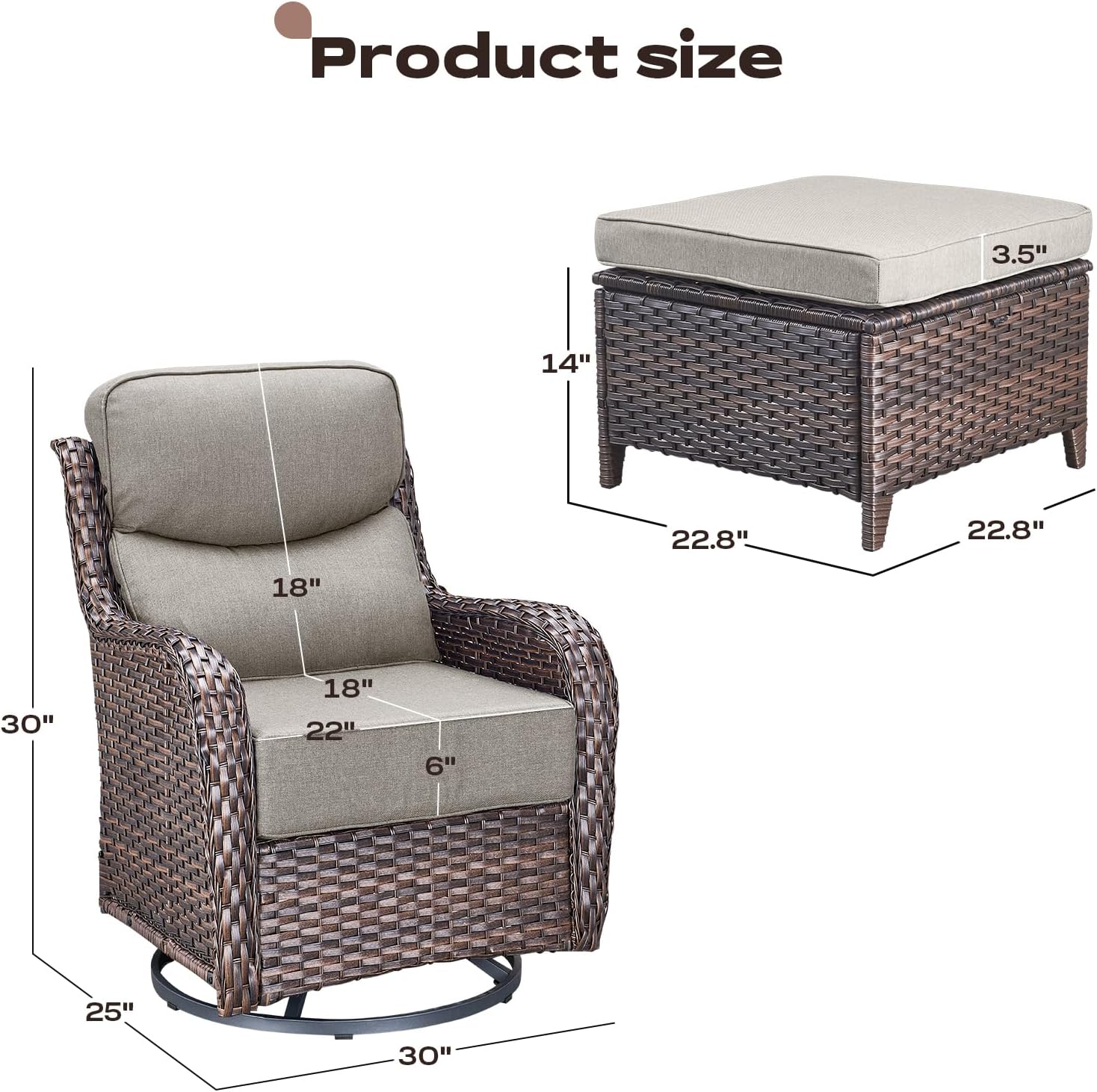 Wicker Outdoor Patio Furniture Set - 4 Piece Patio Conversation Set with Swivel Rocker Chairs and Ottomans, 6 inch Cushions, High Back, Deep Seating, for Porch Deck Garden Brown/Beige