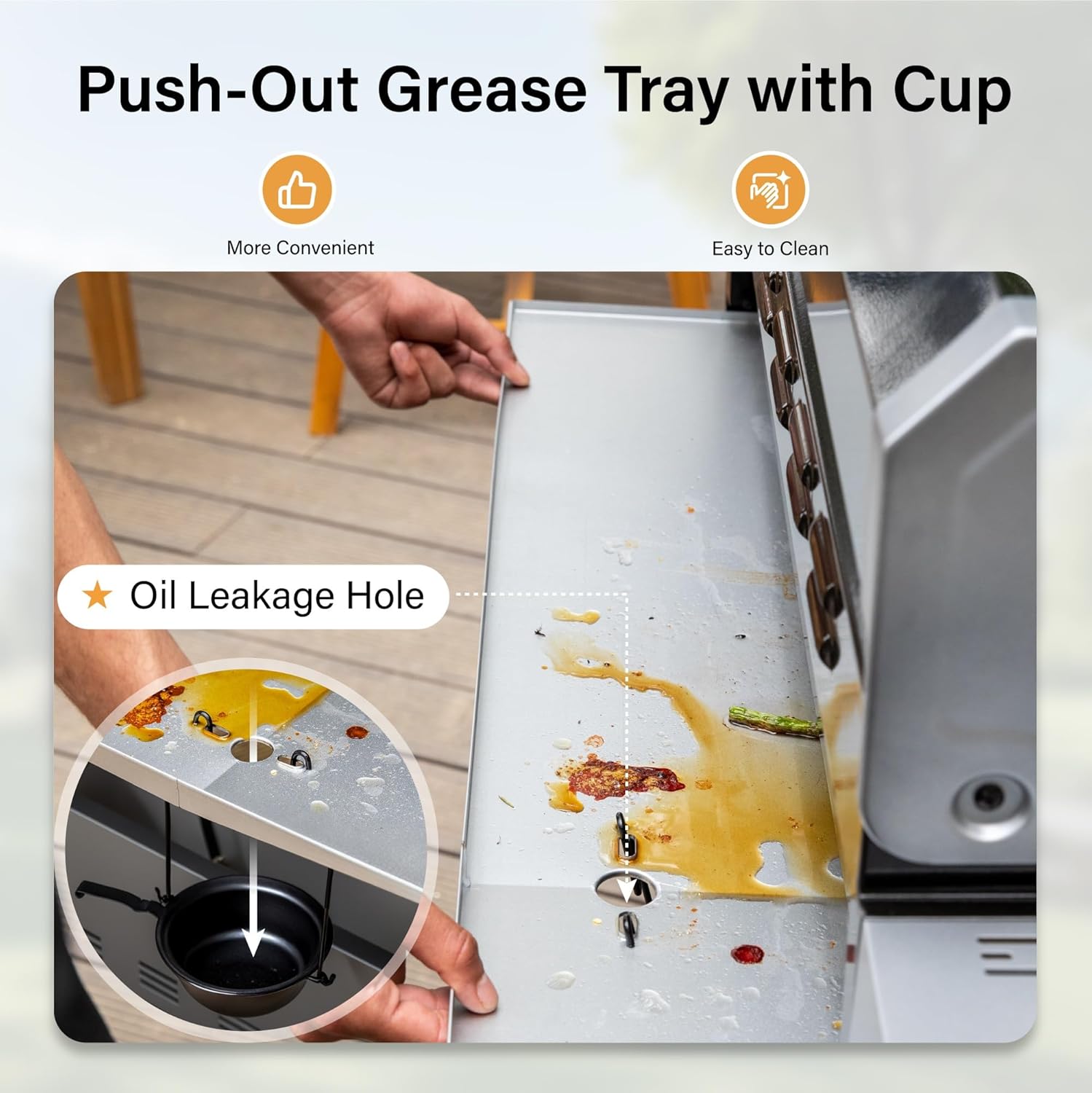 - 𝗘𝗮𝘀𝘆-𝗖𝗹𝗲𝗮𝗻 𝗖𝗼𝗻𝘃𝗲𝗻𝗶𝗲𝗻𝗰𝗲: The slide-out grease tray and removable drip pan make cleanup a breeze. Spend less time scrubbing and more time enjoying your gas BBQ grill - perfect for busy hosts who love hassle-free grilling
