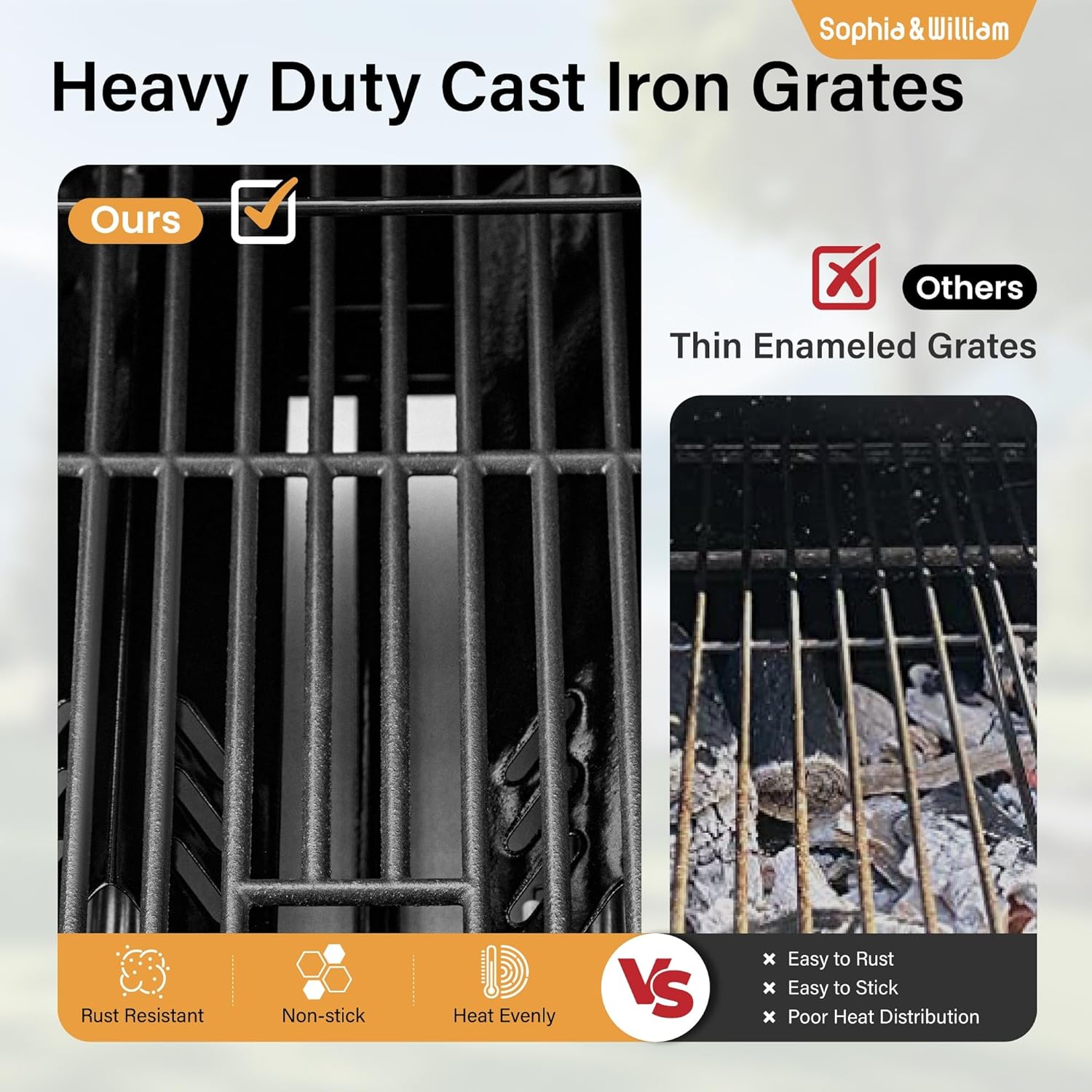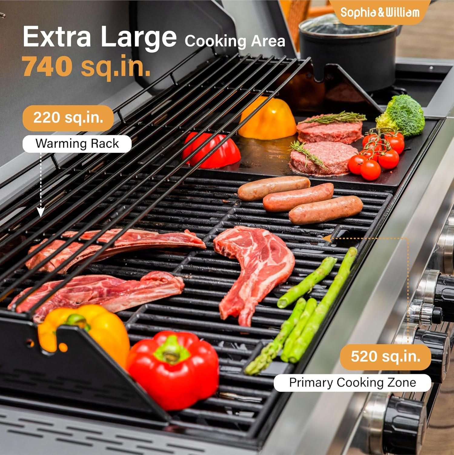 - 𝗗𝘂𝗮𝗹-𝗙𝘂𝗻𝗰𝘁𝗶𝗼𝗻 𝗣𝗼𝗿𝗰𝗲𝗹𝗮𝗶𝗻-𝗘𝗻𝗮𝗺𝗲𝗹𝗲𝗱 𝗖𝗮𝘀𝘁 𝗜𝗿𝗼𝗻 𝗚𝗿𝗮𝘁𝗲𝘀: Sophia & William 6-burner gas grill features innovative grill griddle combo grates, offering authentic sear marks on one side and a flat-top cooking surface on the other. Made from heavy-duty cast iron for superior heat retention, the reversible design provides ultimate versatility - perfect for steaks, burgers, pancakes, and stir-fry. Enjoy professional results and effortless cleanup with this all-in-one outdoor cooking solution