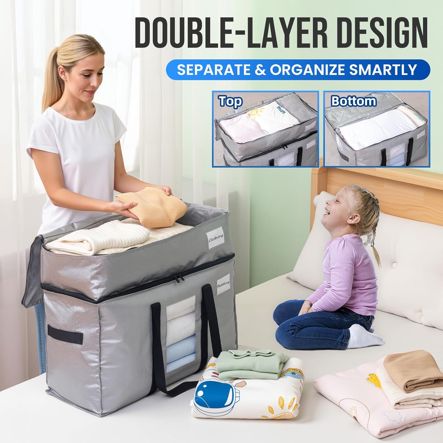 TAILI 2 Tier Extra Large Moving Bags, 2 Pack Silver Heavy Duty Totes For Storage with Visible Window, Wrap Around Handles, Storage Bags for Space Saving, Alternative to Moving Boxes