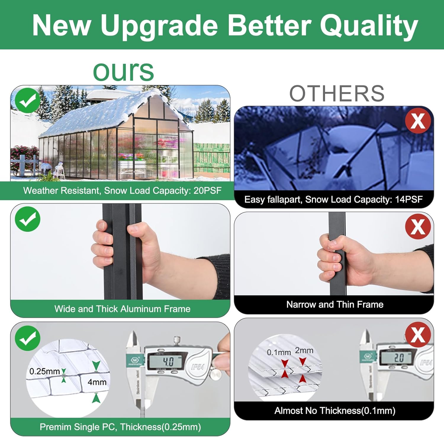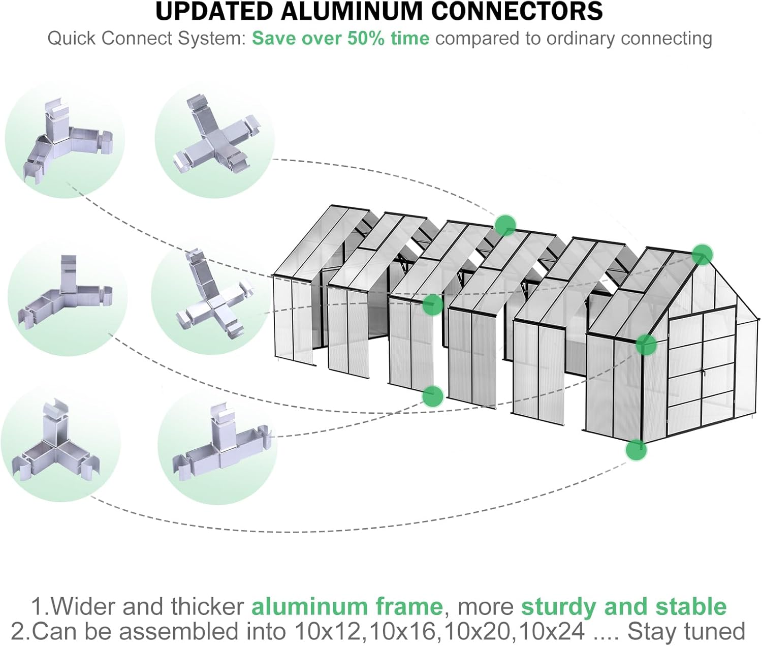 - Sturdy Frame: Our greenhouse kit boasts a robust rust-resistant aluminum frame designed to withstand various weather conditions. Introducing patented technology, Easy assembly, saving you 50% of your time. Gone are the days of tedious setups. With a simple push and locking screw, our Quick Connect ensures a reliable, secure, and swift link-up. It can also support snow loads of up to 20PSF.