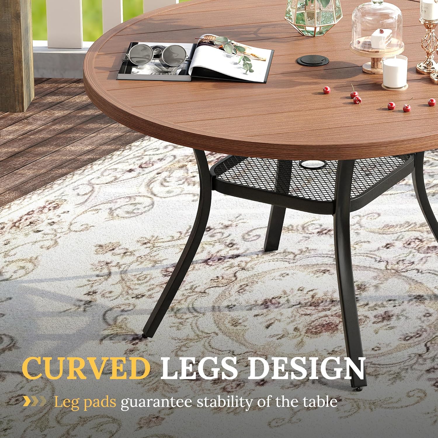 - 【Patio Dining Table】Patio round table set features a powder-coated frame, the bent leg design serves better stability and greater aesthetics, outfitted with an adjustable umbrella hole (1.57" -1.9", hole cover included), opening to secure an umbrella to protect your food and guests from the bright sun