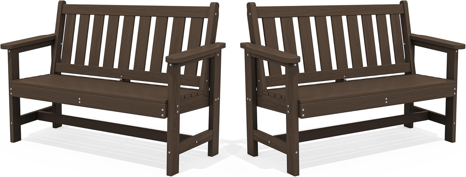 SERWALL Outdoor Bench, HDPE Outdoor Benches Weatherproof, 2-Person Garden Bench with 660 lbs Weight Capacity, Patio Benches for Outdoors, Garden, Porch, Backyard and Park, Coffee, 2 Pack