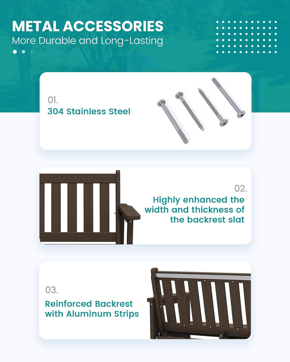 - High Weight Capacity: Tested to support up to 660 lbs, this outdoor bench is suitable for people of various body types and sizes. Its sturdy structure and premium materials ensure lasting performance.