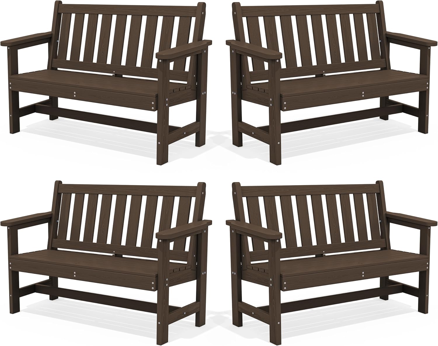 SERWALL Outdoor Bench, HDPE Outdoor Benches Weatherproof, 2-Person Garden Bench with 660 lbs Weight Capacity, Patio Benches for Outdoors, Garden, Porch, Backyard and Park, Coffee, 4 Pack