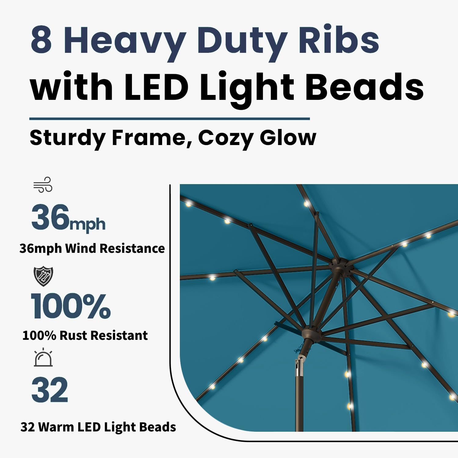10FT Solar Umbrella 32 LED Lighted Patio Umbrella Table Market Umbrella w/Tilt and Crank, UV-Resistant Outdoor Umbrella for Pool, Garden, Deck, Lake Blue