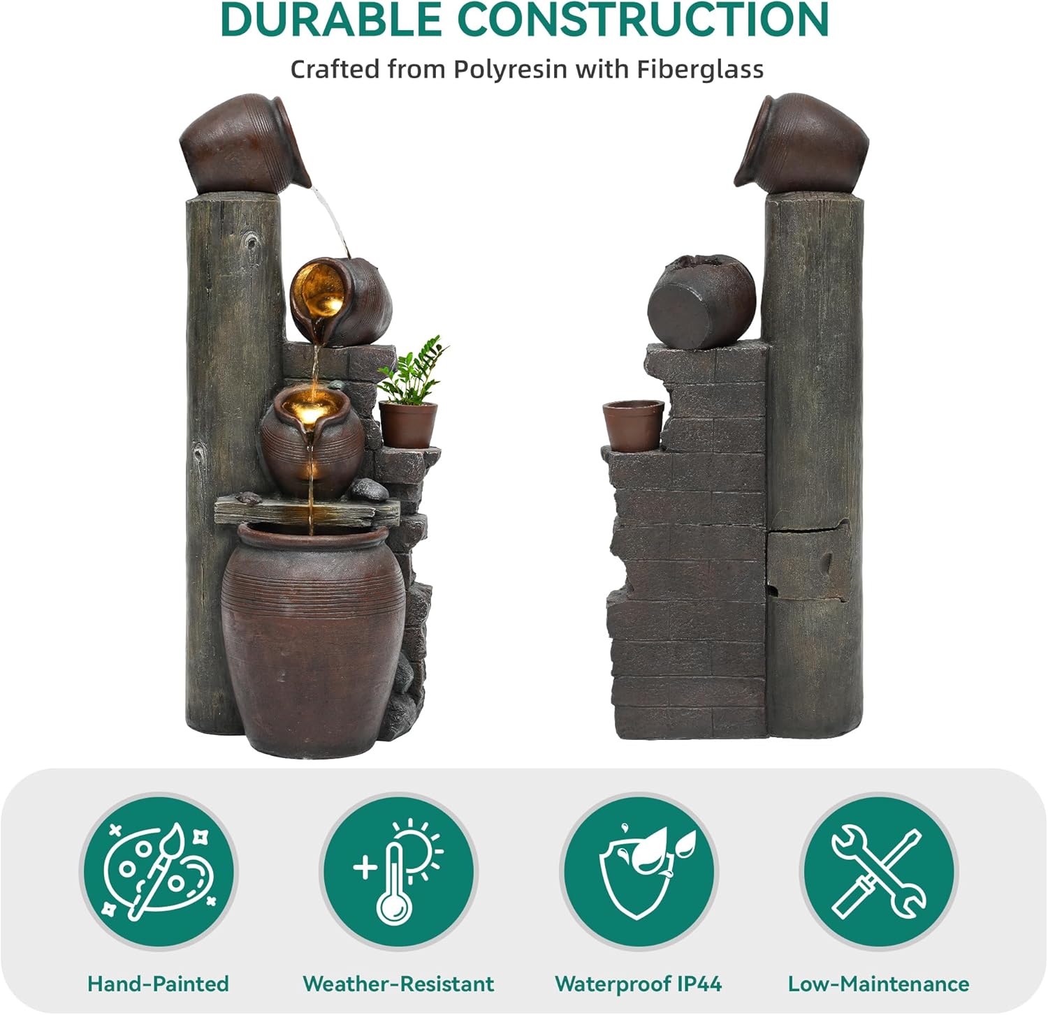 - CLASSIC STACKED CLAY POT DESIGN: Our outdoor resin fountain features rustic clay pots stacked on posts and stones. With handcrafted embossed textures and an antique finish, it adds a mystical, vintage charm to any outdoor space. Measuring 16.14"L X 14.96"W X 39.37"H, an eye-catching focal point for any garden, patio, or outdoor living space.
