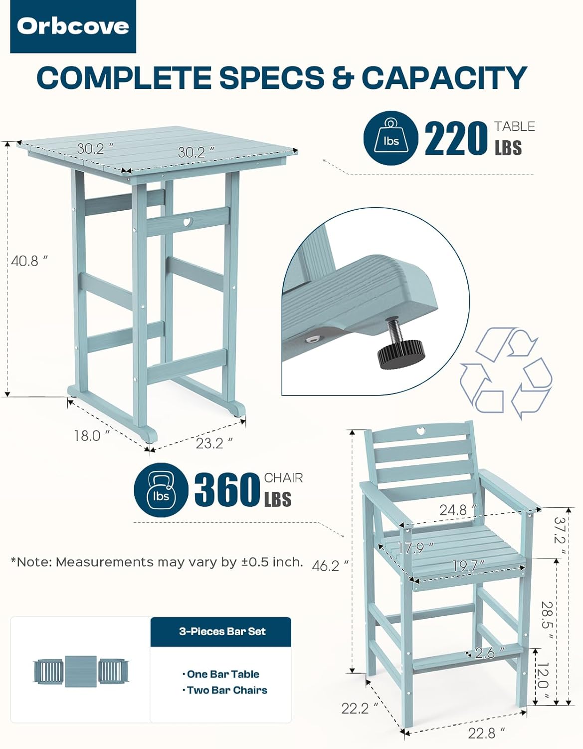 - Durable All-Weather Design: (Please note!!!Your order consists of two separate packages, which may be delivered at different times.) Crafted from HDPE with a natural wood grain finish, Orbcove bar table and chairs set withstands sun, rain, and wind without fading or cracking. Ideal for deck furniture, backyard furniture, or porch furniture, it’s perfect for year-round outdoor living.