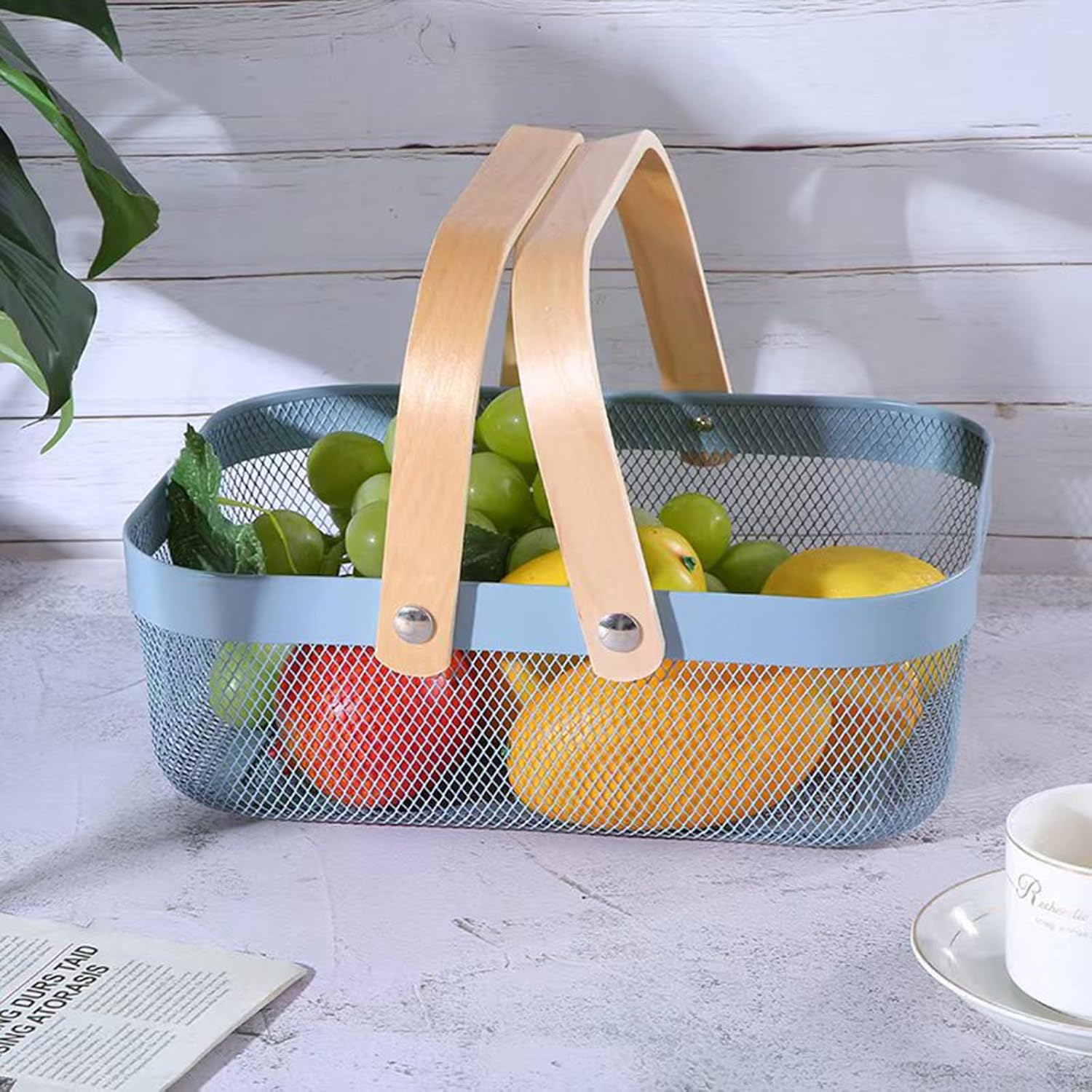 - The metal mesh storage organizer baskets bin with wooden handle is a great way to organize or decorate your home, office, apartment, lofts, or other living spaces. This wire basket also can be a fruit basket or garden basket and storing those fruits and vegetables outside the refrigerator. Also as extra storage to meet your needs for household use.