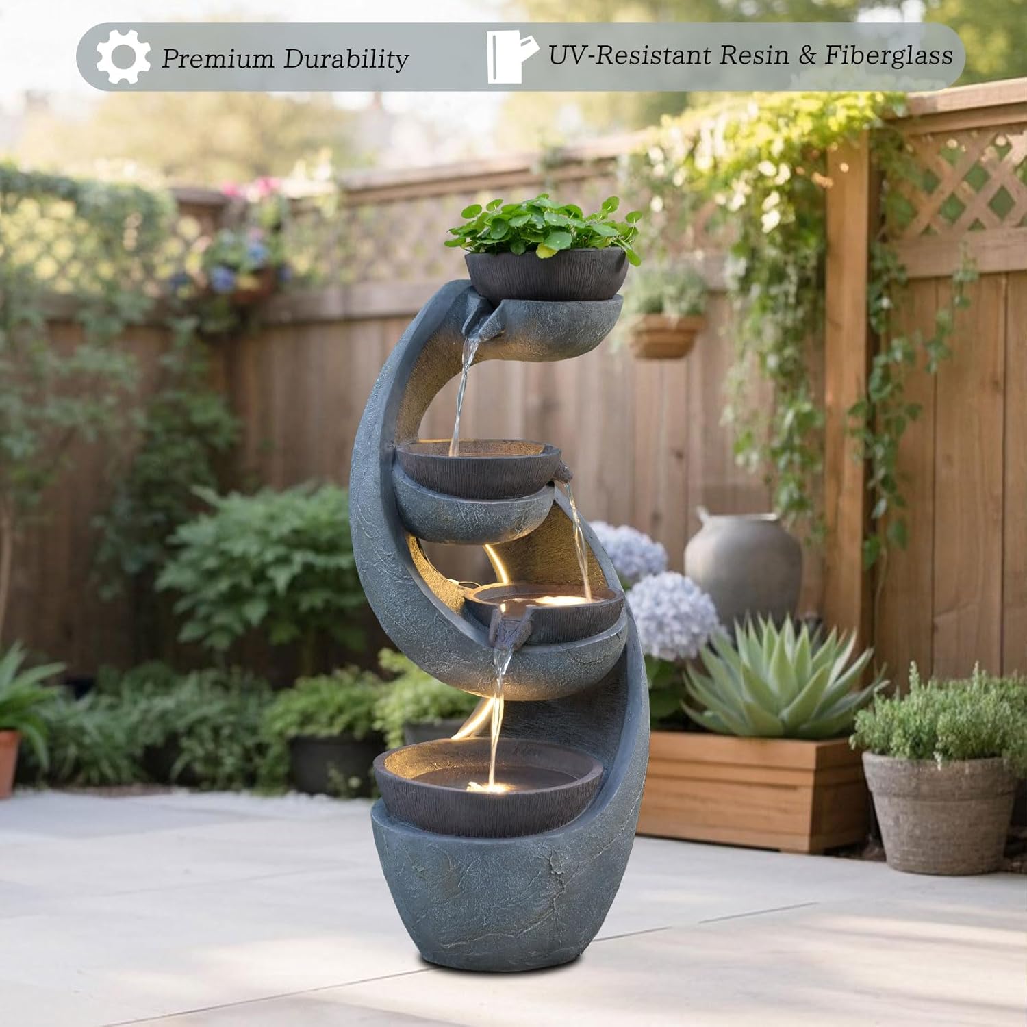 - 🌞 All-Weather UV-Resistant Durability Built with premium UV-resistant resin and fiberglass, this outdoor fountain resists fading, cracking, and extreme temperatures for year-round use.