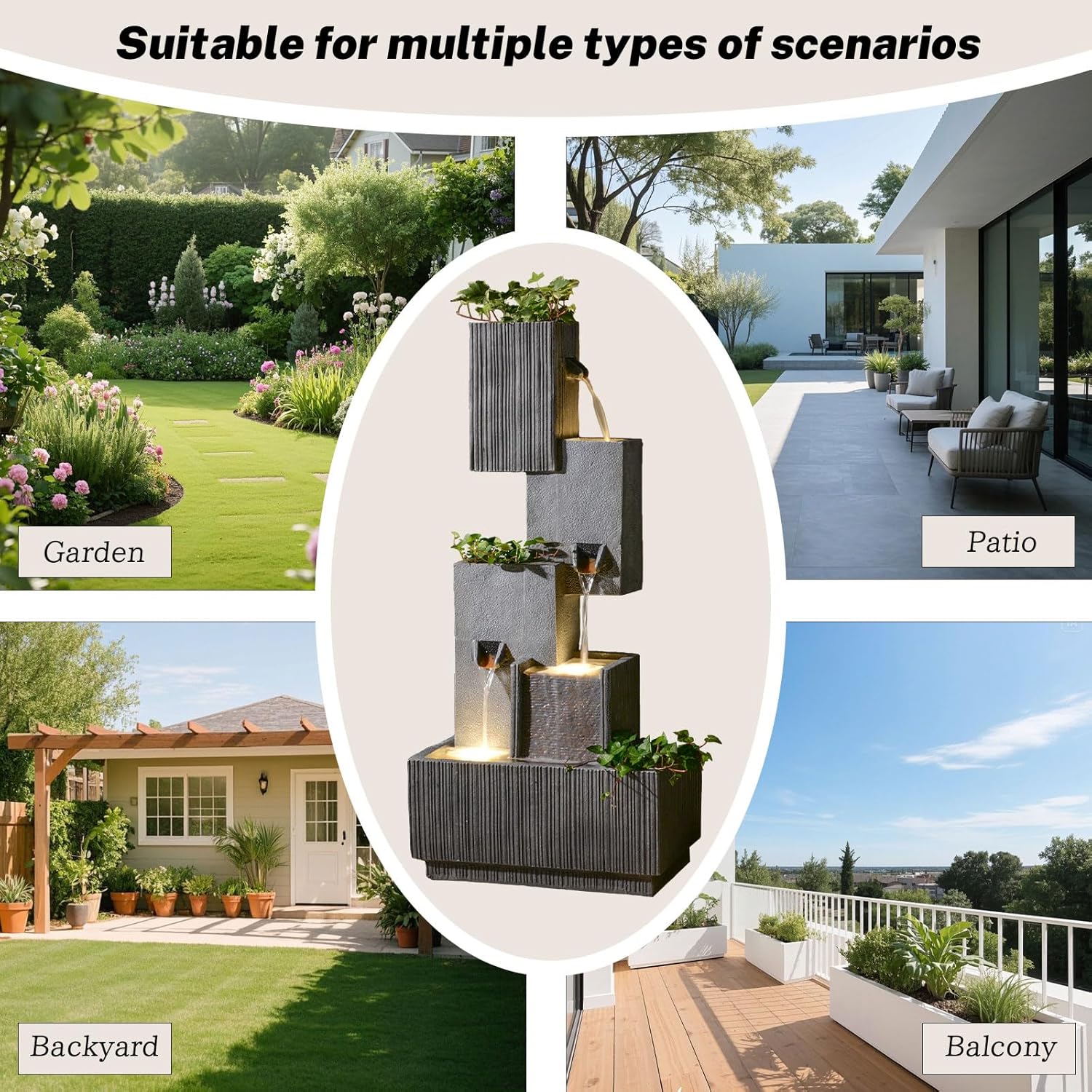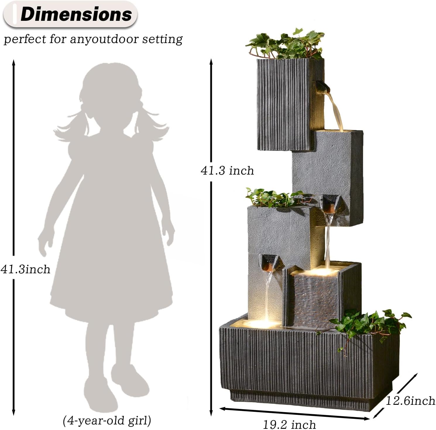 - Durable & Weatherproof Construction: Built from high-quality resin and fiberglass, this fountain resists fading, cracking, and harsh weather, ensuring year-round beauty in rain, snow, or sun.