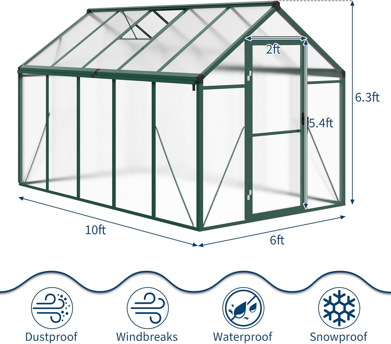6x10 FT Greenhouse, Easy Assembly Aluminum Polycarbonate Greenhouses for Outdoors with Roof Vent and Ground Nails, Heavy Duty Aluminum Walk-in Greenhouse for Backyard, Sliding Lockable Door, Green