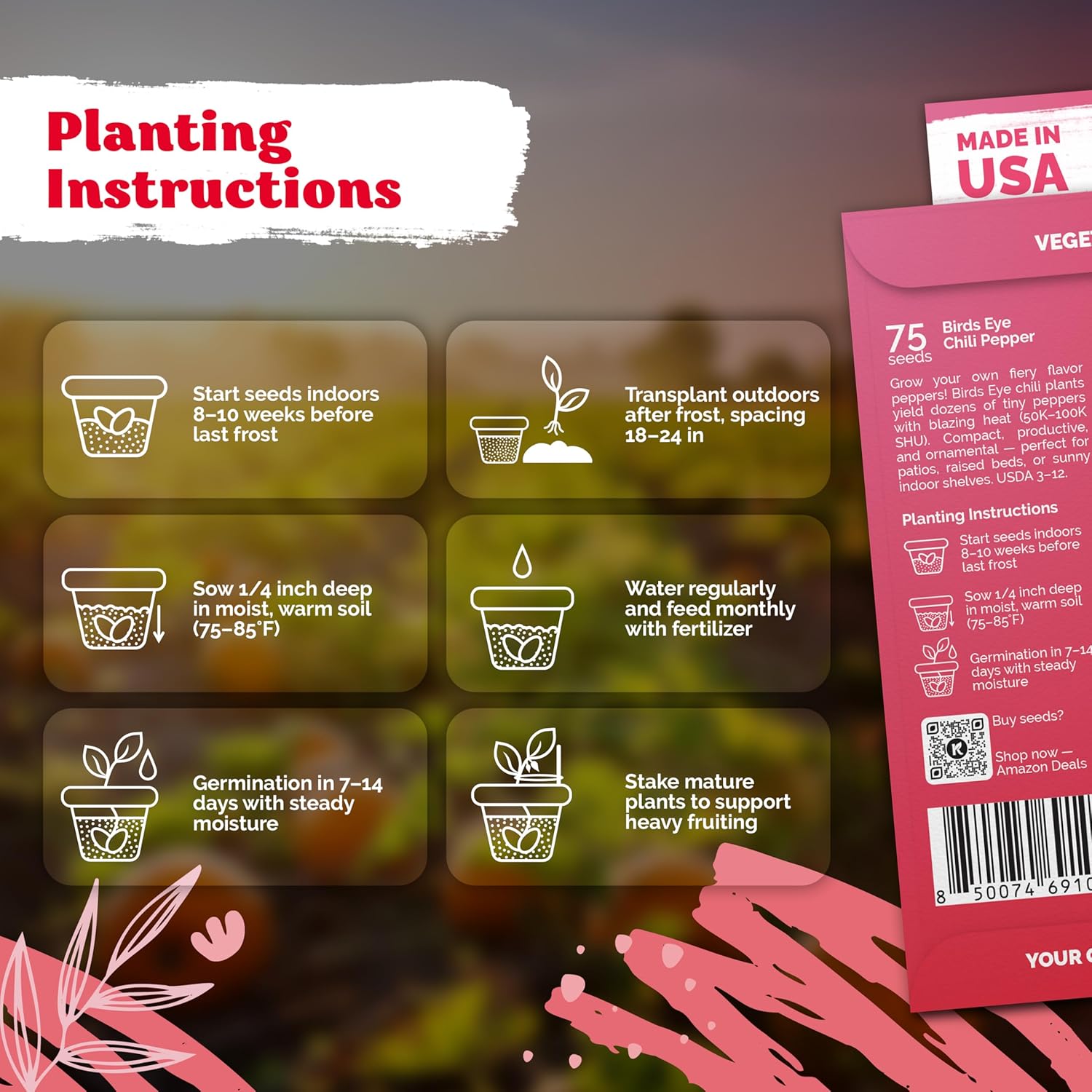 - Easy to Plant & Care: Sow birds eye chilis heirloom seeds 1/4" deep, spacing 18–24" indoors 8-10 weeks before last frost, then transplant outdoors. Capsicum annuum loves full sun, fertile 6.0-6.8 pH soil, moderate moisture. Harvest in ~120-140 days.