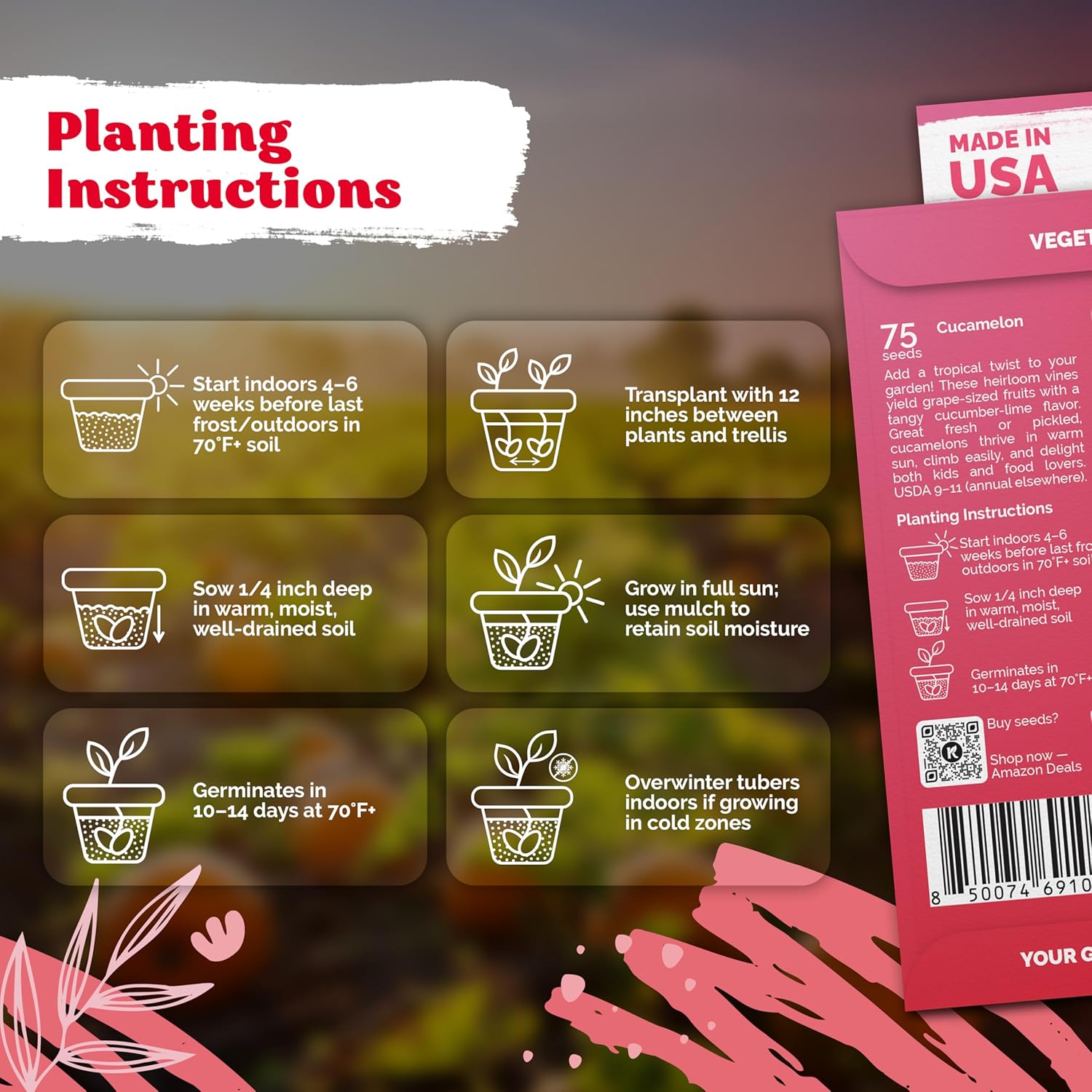 - High Germination Rate: cucamelons seeds sprout in 10-14 days at 70 °F, Full sun, Start inside 4 weeks before last frost or outdoors in warm soil. Sow 1/4" deep, space 9-12" apart – perfect climbing cucumber seeds for patio or vegetable garden.