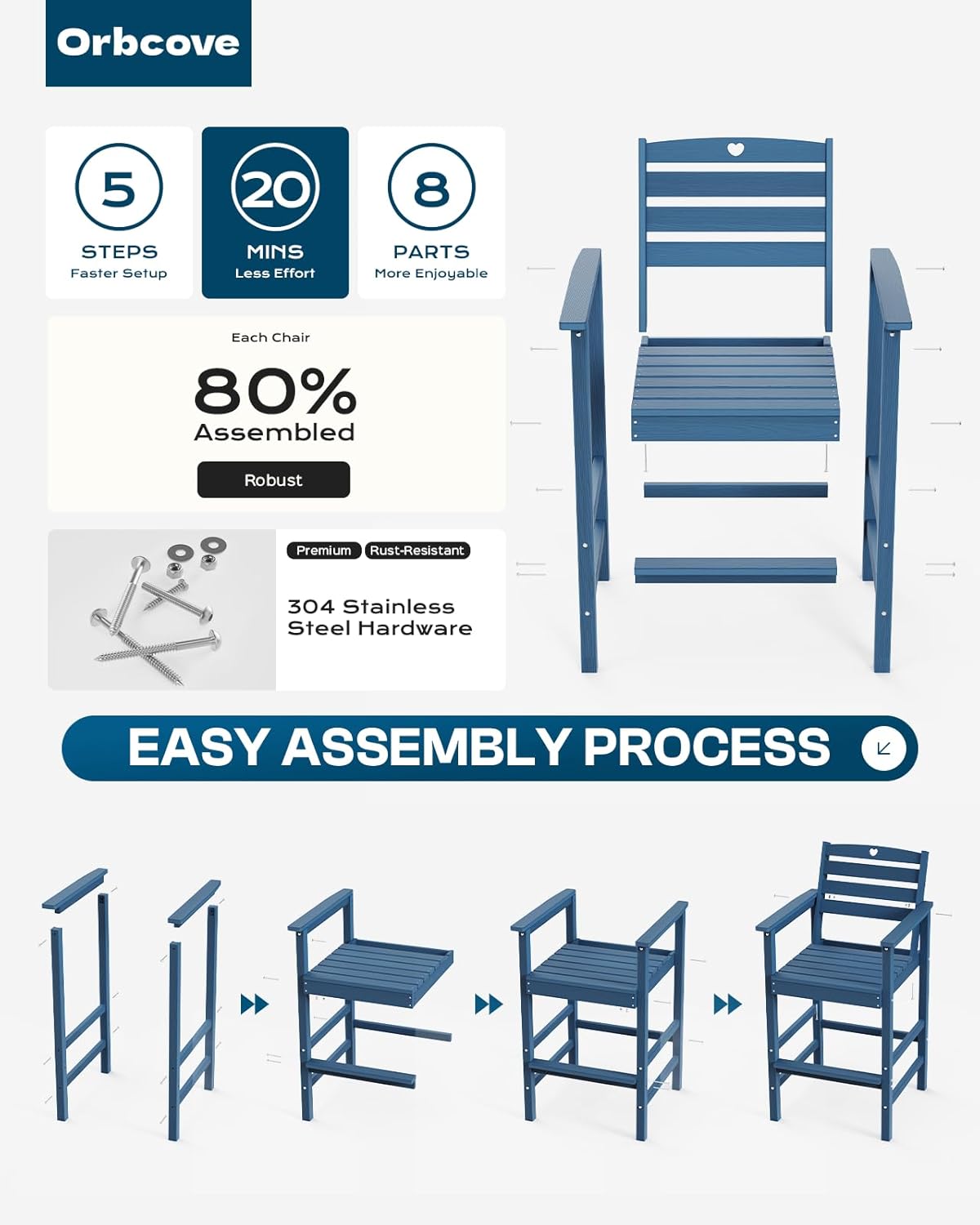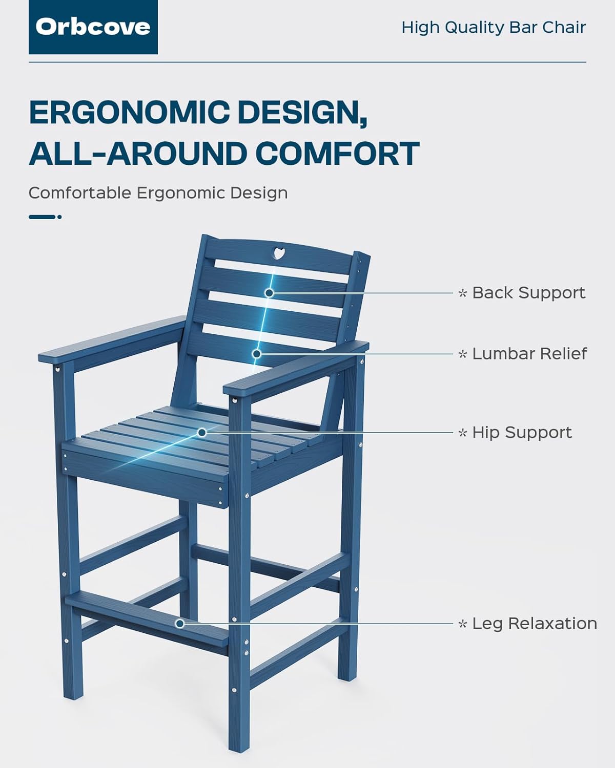 Tall Adirondack Chairs Set of 4, HDPE Wood Balcony Adirondack Chairs Set with Heart Cutout Design, Weather-Resistant Bar Height Furniture for Deck, Porch, Pool (Navy Blue)