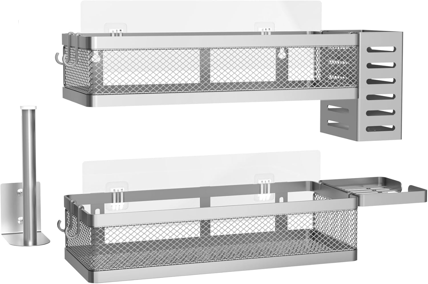 - 【MULTI-PURPOSE&MULTIFUNCTIONAL】5 Hanging Storage Baskets Organizer Set for Sufficient Bathroom Kitchen Storage Space, The bathroom&Kitchen organizer comes with 5 pieces for different uses, including 2 Hanging Storage Baskets, 1 soap holder,1 Tissue holder ,1 utensil holder and 2 adhesives. The perfect solution for organizing a multitude of every items indoor or outdoor. The cabinet organizer hanging baskets wall mount is Ideal for organizing and storing spice bottles, pantry items, snacks, toiletries, tools, craft supplies,etc. And this metal bin basket free up enough space for your homes, kitchen, living room, bathroom, camper, farmhouse, apartments, college dorm rooms, etc.