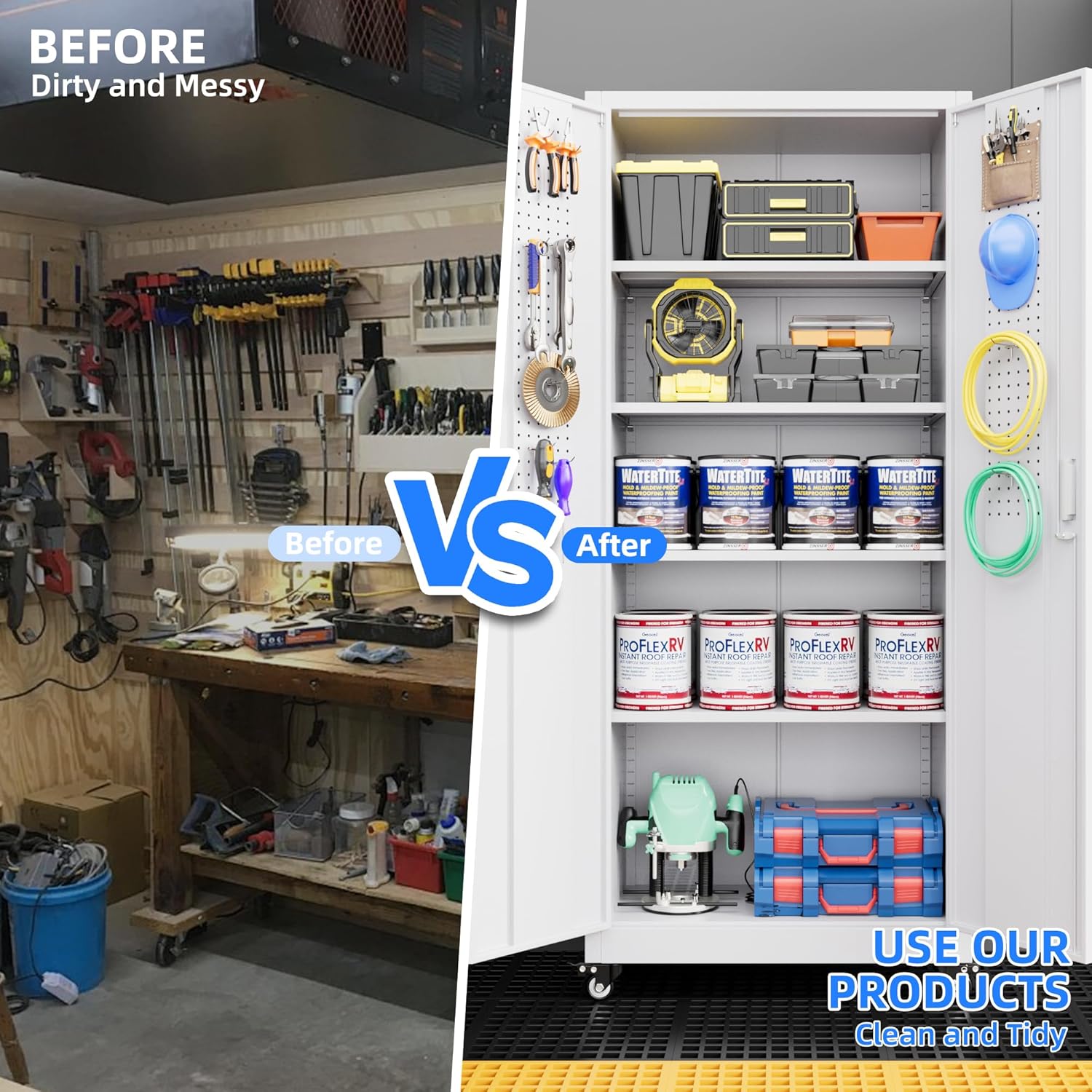 - 360 Degree Rotating Wheels for Effortless Mobility: Move the garage storage cabinet cabinet with ease using its 360-degree rotating, lockable wheels, offering smooth, silent transport across floors. The wheels are detachable—install them for mobility or remove them for stationary use, ensuring versatility without compromising stability;