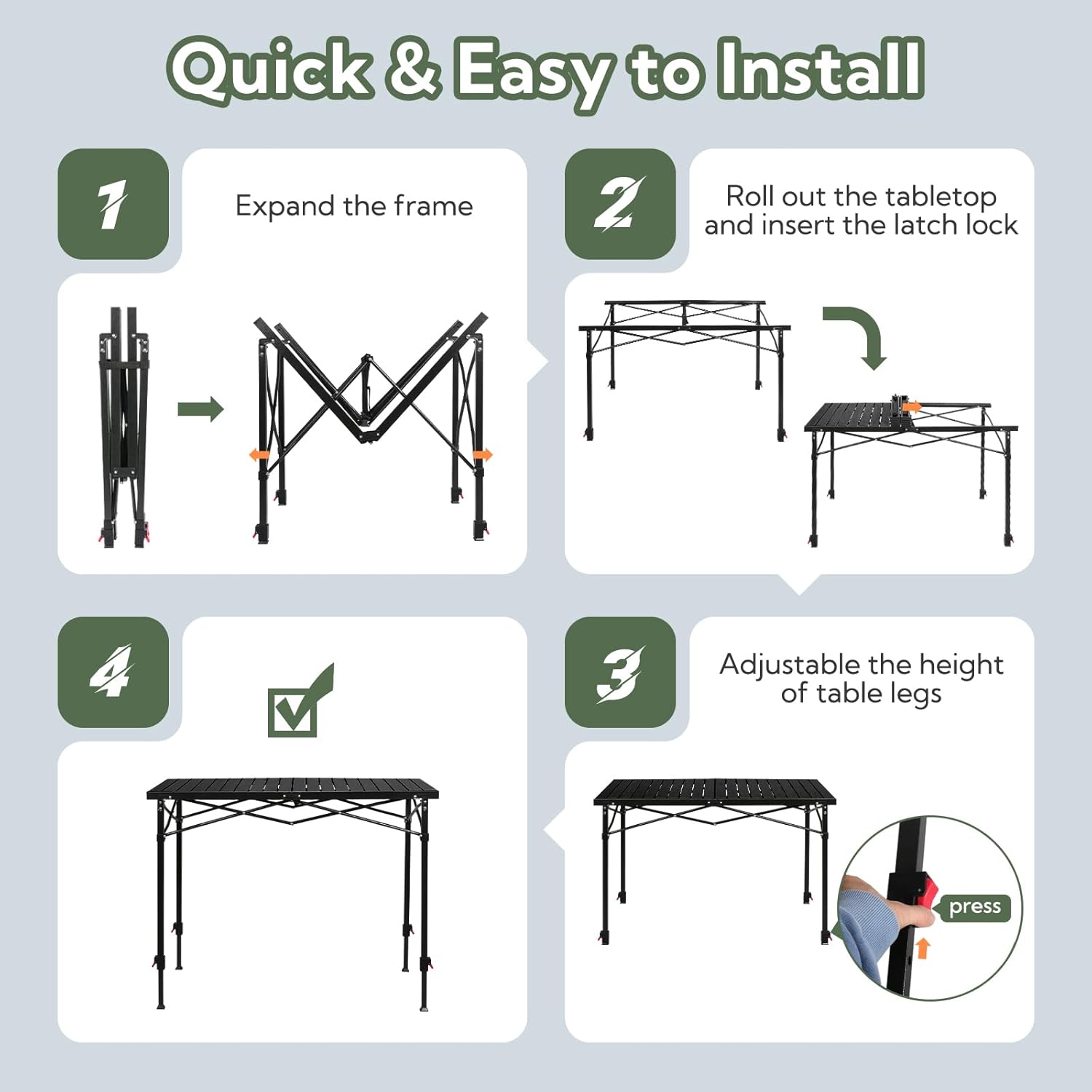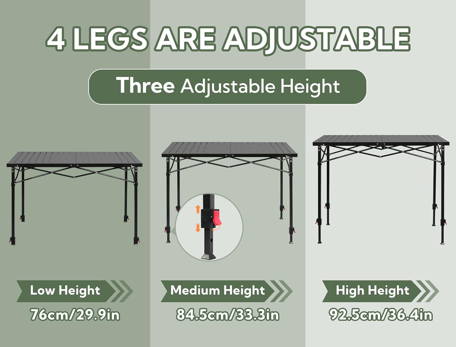 - Adjustable Height: Join Nature camping table designed with telescoping legs for three heights: 29.9'' -33.3'' -36.4'' , to fit the needs of different heights or different scenarios