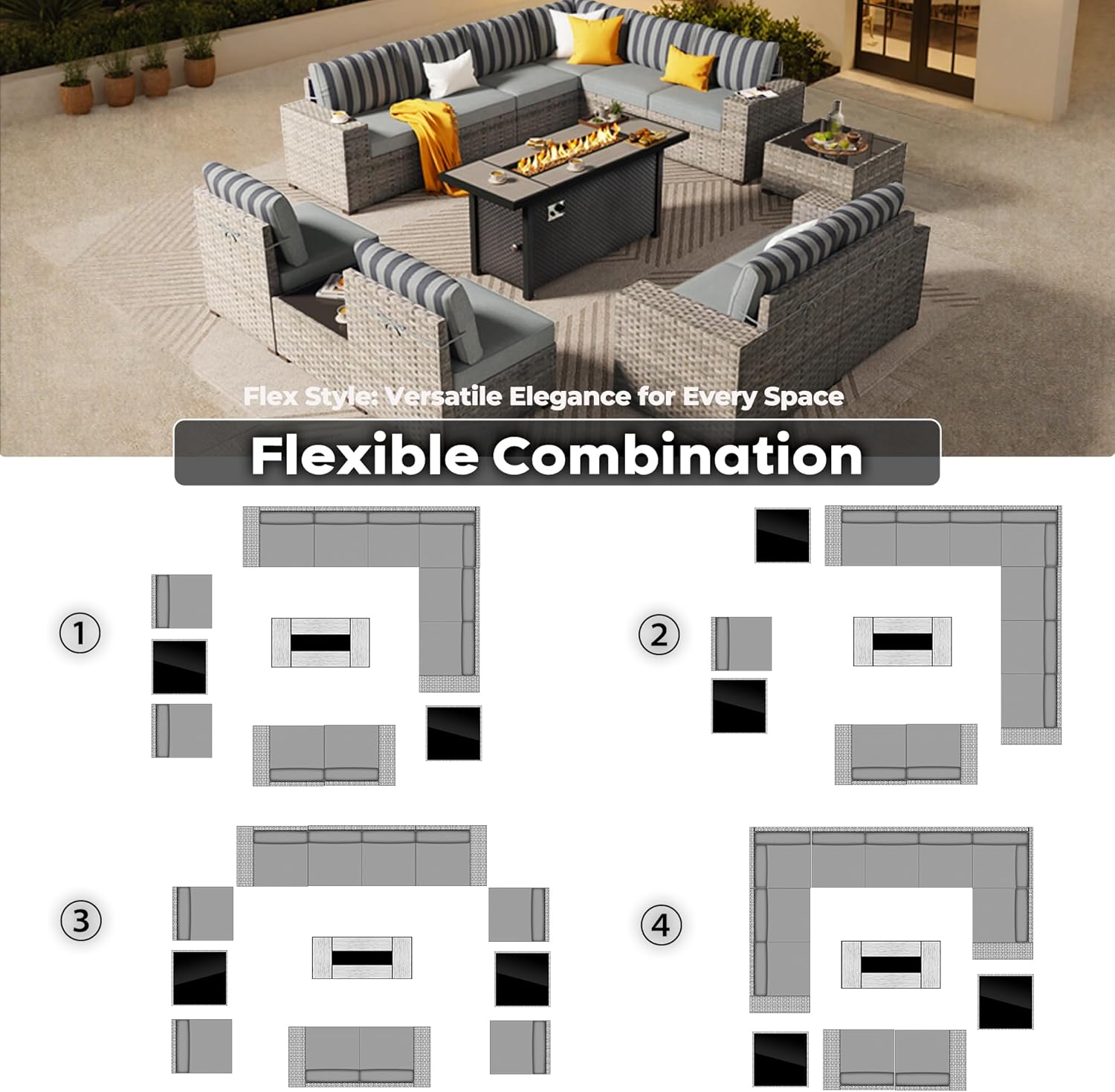 - Modular Combination: Outdoor sectional sofa set can be separated into 10 single seats, which can be freely combined with the included connecting clips to create the outdoor seating arrangement you want to fit into a variety of spaces