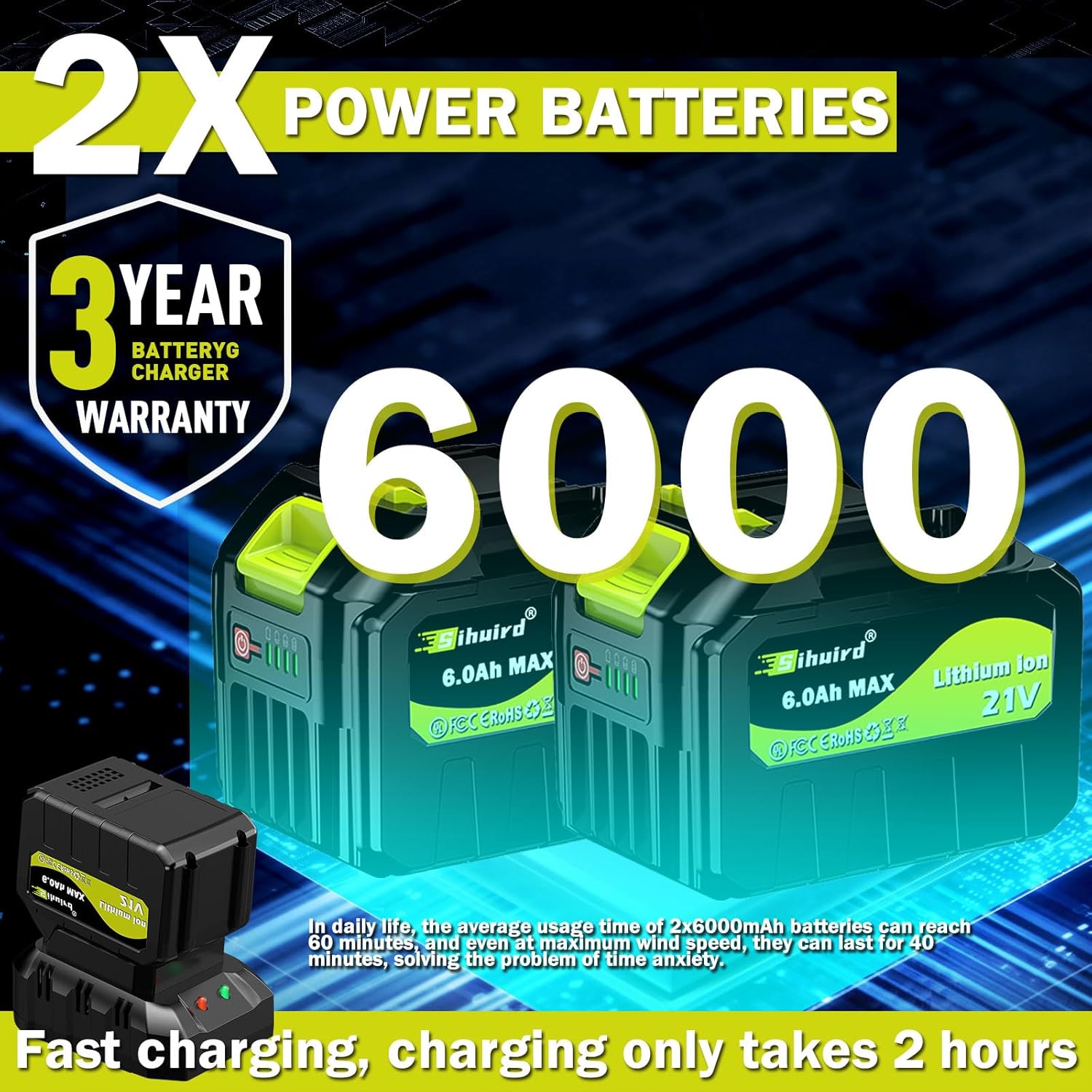 - 【Fast Charging】:The Sihuird Cordless Leaf Blower is equipped with a fast charger, and a 6000mAh high-capacity battery can be charged in just 2 hours.