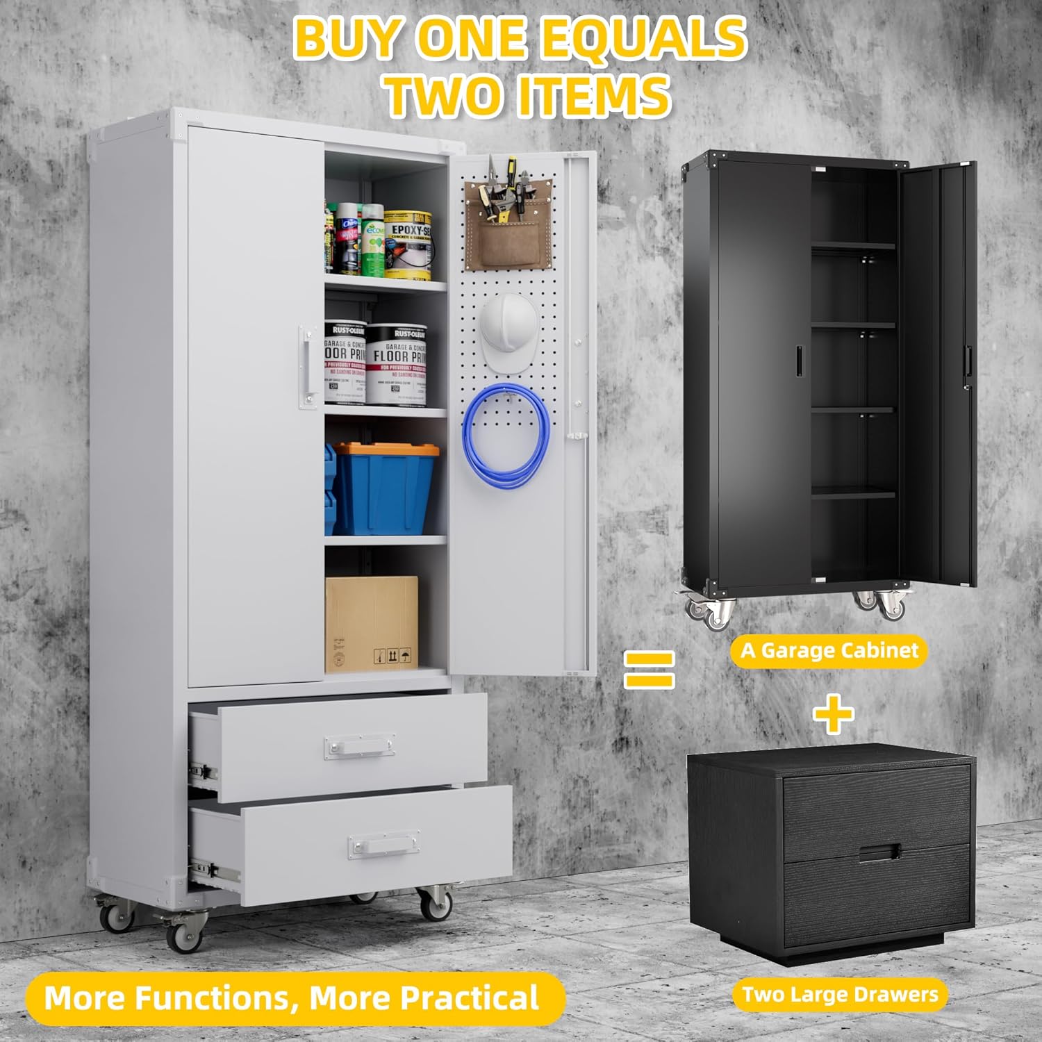 - 【Upgraded Design & More Space】Storage cabinet offers plenty of space to meet your storage needs. There are pegboard on the cabinet 2 doors and it has 6 hooks and can be used to hang objects. The two drawers at the bottom can store sundries or documents.