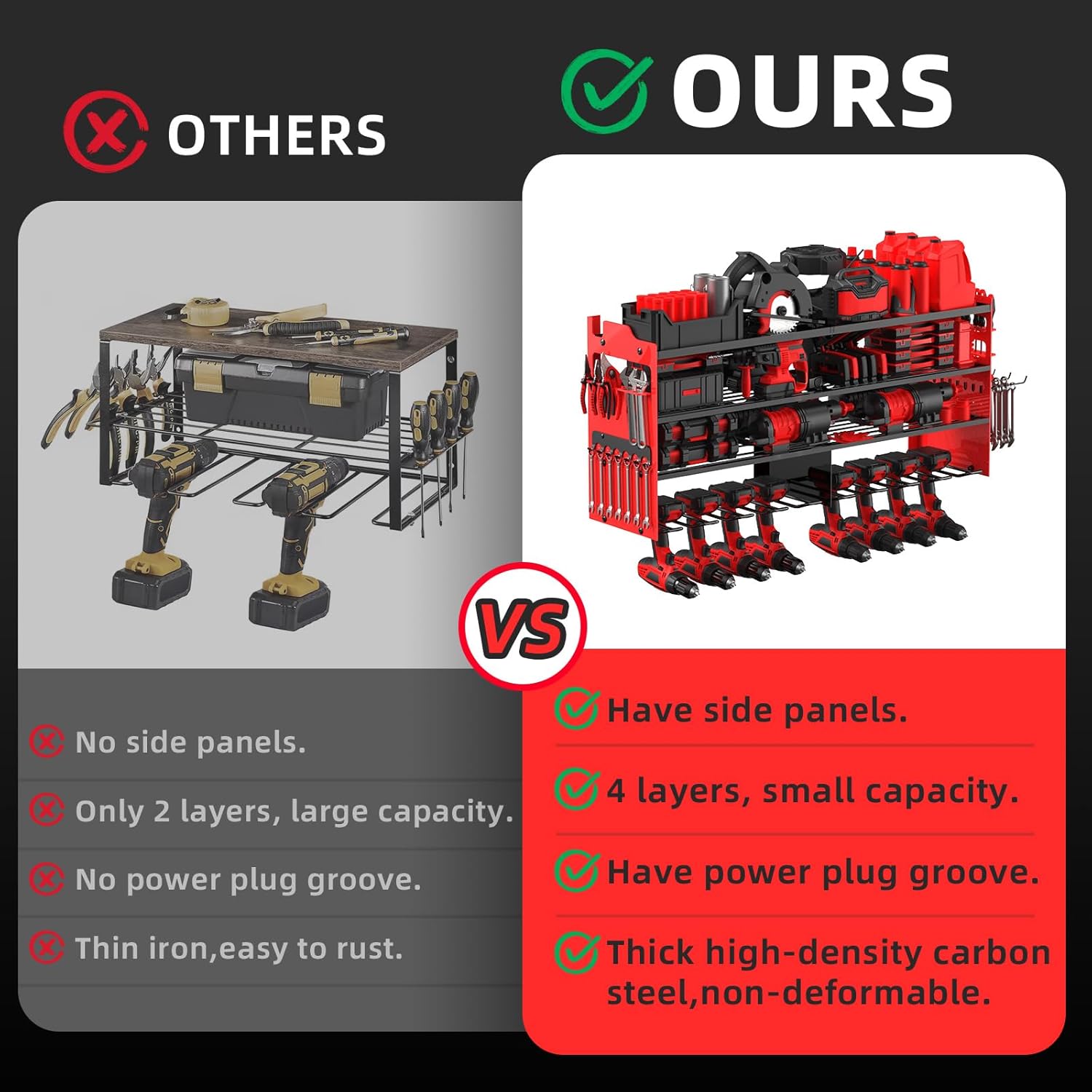 - 【LARGE CAPACITY&SIDE PLATES】This wall-mounted power tool organizer is more storage space than standard tool racks.It has 8-layer high-capacity design and 4 cordless drill holders and 2 side-plates, great for storge electric drills/power drivers/impact wrenches/mpact drills/cutters/angle grinders and other handheld power tools.The 4-layer can hold batteries, saws,wrenches,chargers and other tools, and the side racks can hold wrenches/screwdrivers/hammers/pliers,scissors,etc.
