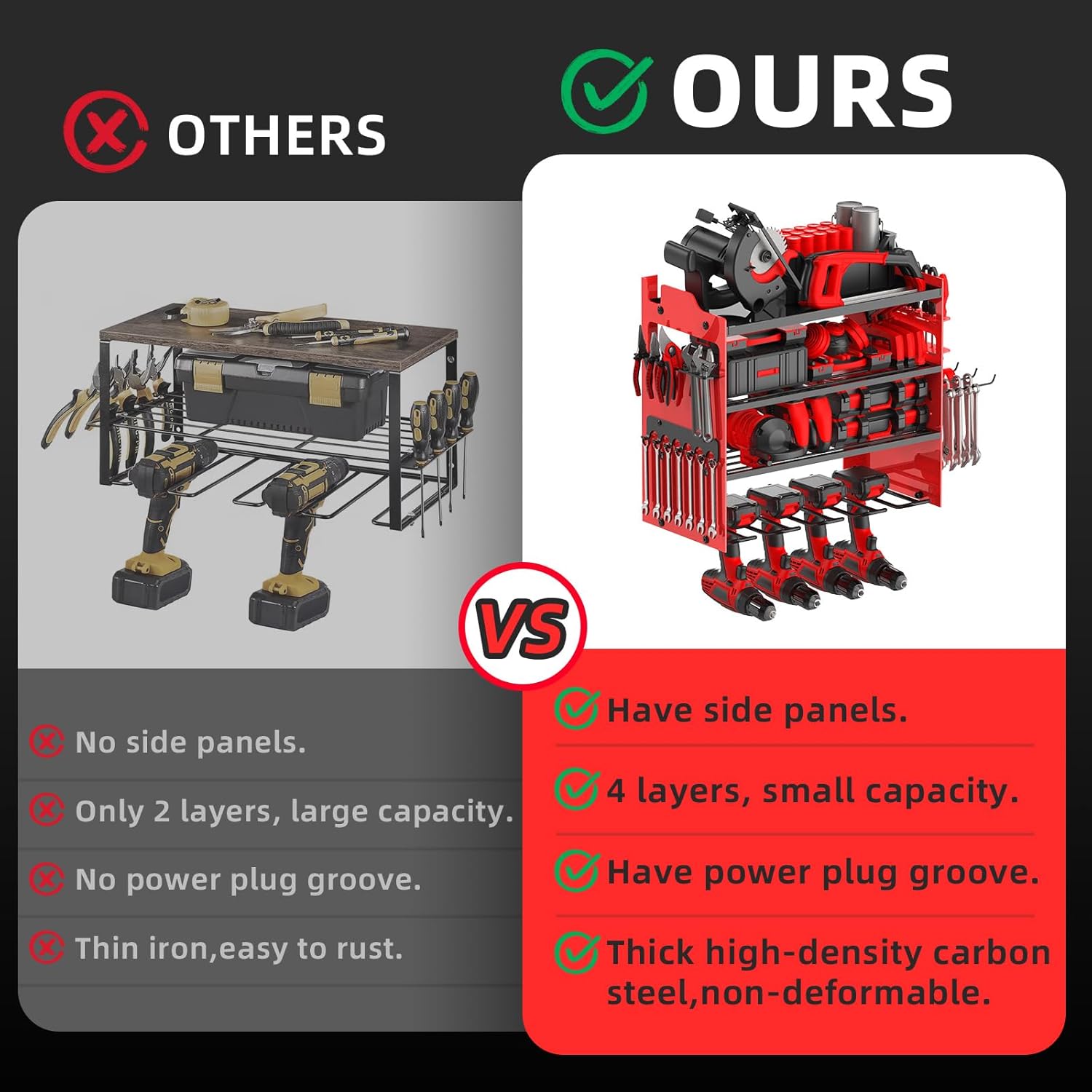 - 🔧【LARGE CAPACITY&SIDE PLATES】This wall-mounted power tool organizer is more storage space than standard tool racks.It has 4-layer high-capacity design and 4 cordless drill holders and 2 side-plates, great for storge electric drills/power drivers/impact wrenches/mpact drills/cutters/angle grinders and other handheld power tools.The 4-layer can hold batteries, saws,wrenches,chargers and other tools, and the side racks can hold wrenches/screwdrivers/hammers/pliers,scissors,etc.