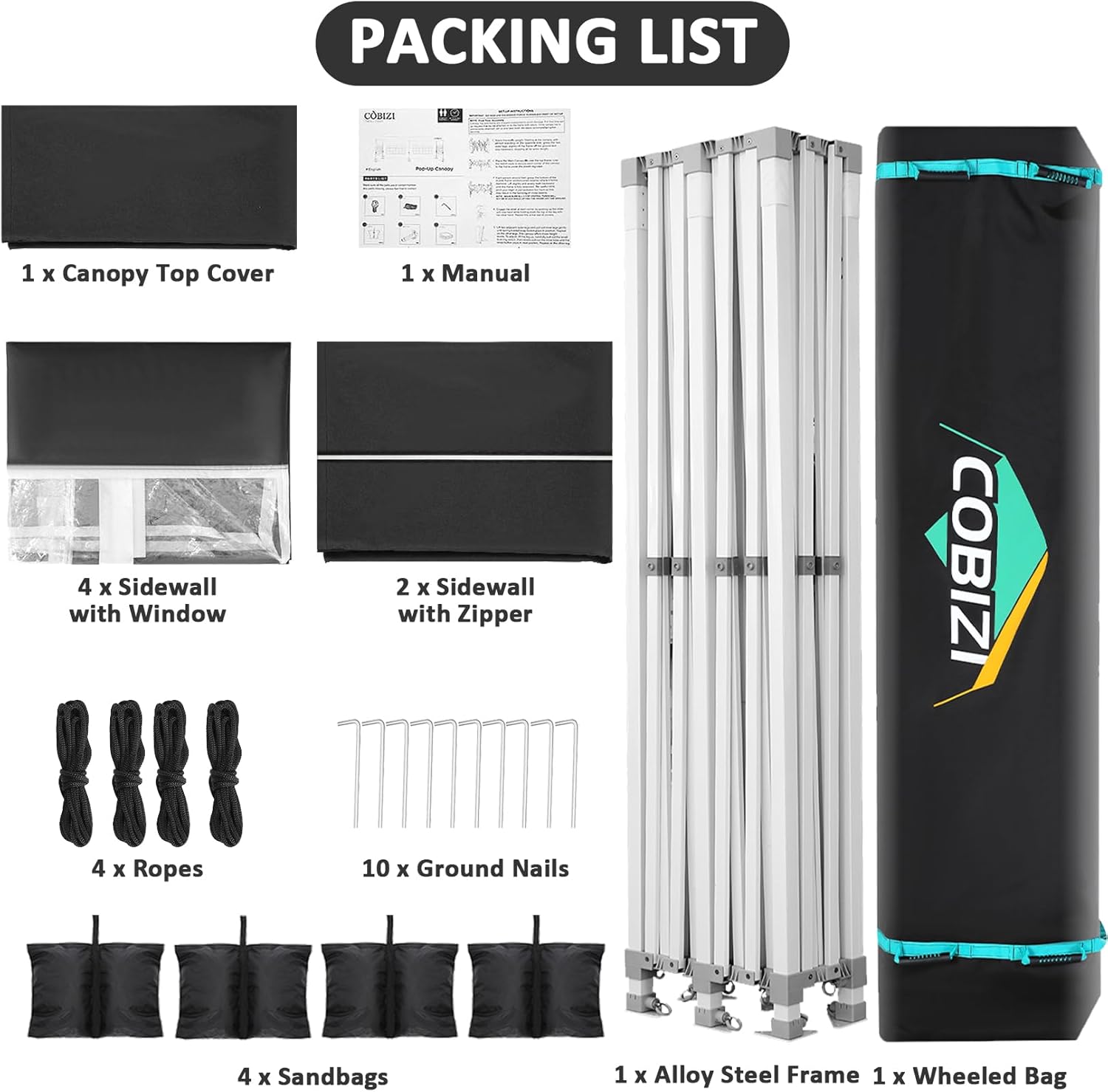 - 【Wheeled Storage Bag】13x26 canopy wheeled roller bag size is 213x50x30cm (83.9x19.7x11.8inch), 1680D Oxford Cloth fabric. Storage bag with 3 wheels on the bottom for easy transport. 4 handle on the side for 2 people to lift. 2 handle on the top for 2 people to glide. The Package Includes: Pop up Canopy Frame x 1Pcs + 13′x26′ Canopy Tent Top Cover x 1Pcs + Sidewall with Zipper x 2Pcs + Sidewall with Window x 4Pcs + Sandbag x 4Pcs + Ground Nails x 10Pcs + Ropes x 4Pcs + Wheeled Storage Bag x 1Pcs.