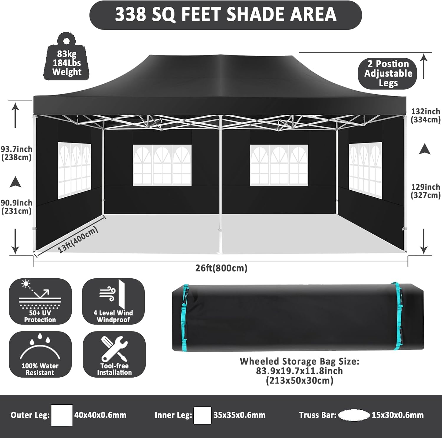 - 【2 Height Settings】13x26 pop up party tent straight leg has 2 height settings. Pull ring lock system easy to lock and release, raise the pop up tent to a desired height. Canopy tent 13x26 straight leg height options: 231cm/90.9inch, 238cm/93.7inch. Corresponding party tent center height options: 327cm/128.7inch,334cm/131.5inch. 13x26 canopy with sidewalls perfect for commercial activities, camping, festivals, tailgating, backyard events and etc..