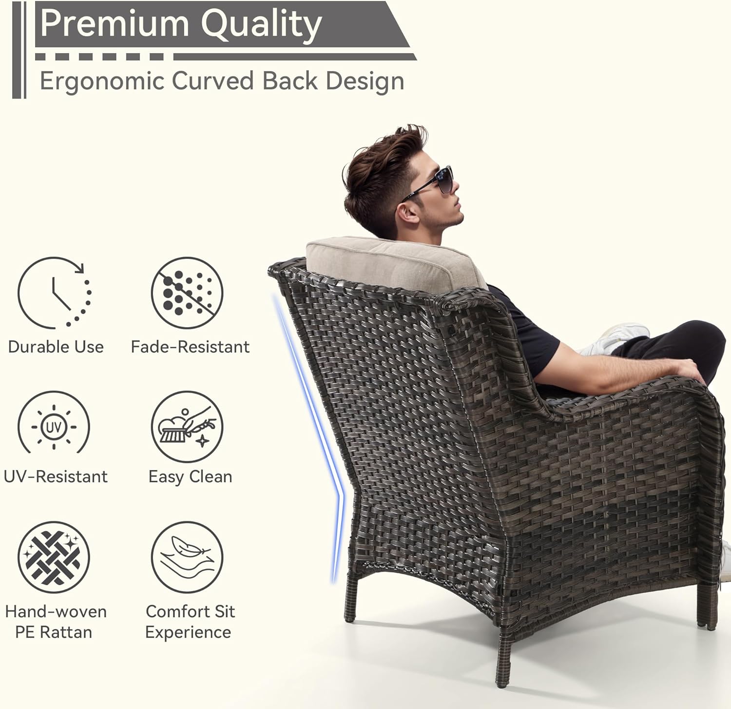 - [Ergonomic Structure] This patio chairs set has comfortable streamlined seats, ergonomically designed backrests and widened armrests, provide the utmost comfort. The soft back & seat cushions make you feel more comfortable