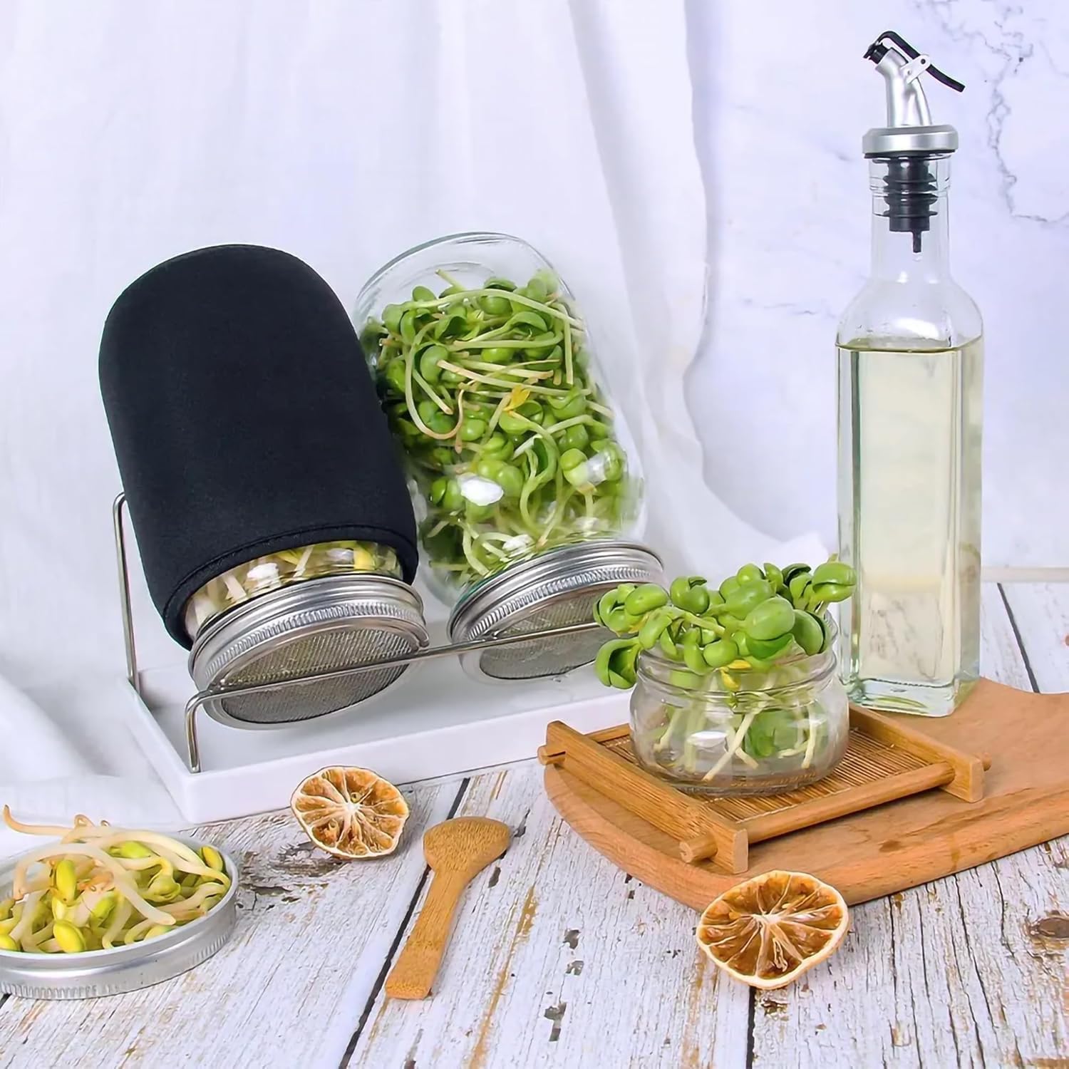 - COMPLETE SPROUTING KIT - Includes 2 Glass jars, 2 screen sprout lids, 1 stainless steel stand, 1 drip tray, 2 blackout sleeves.(SEED NOT INCLUDED)
