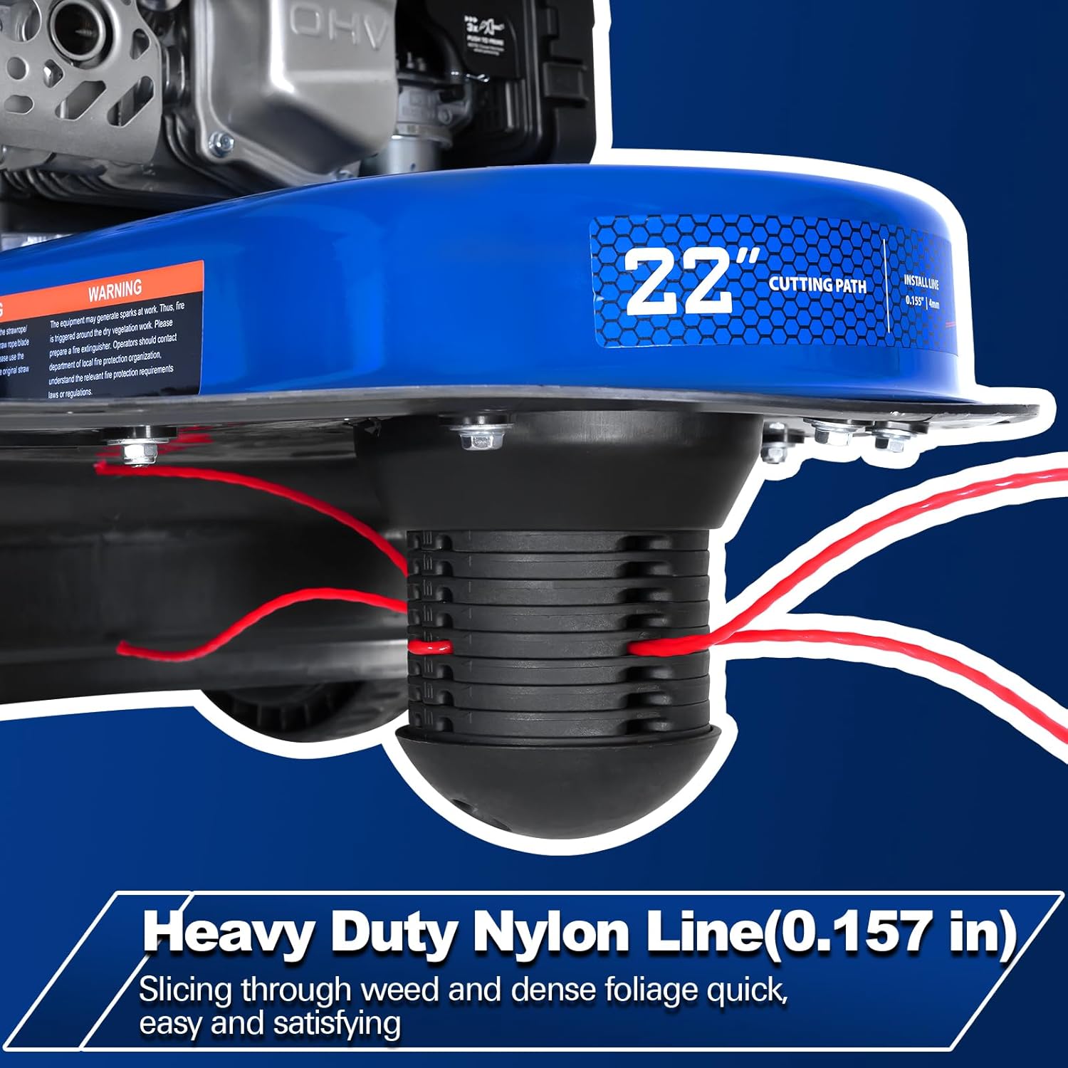 - DURABLE STEEL DECK & WIDE CUTTING PATH: Built with a heavy-duty one-piece steel deck for enhanced stability and reduced vibration. The 22-inch cutting diameter with tough nylon line clears a wide swath in a single pass, saving time and effort.