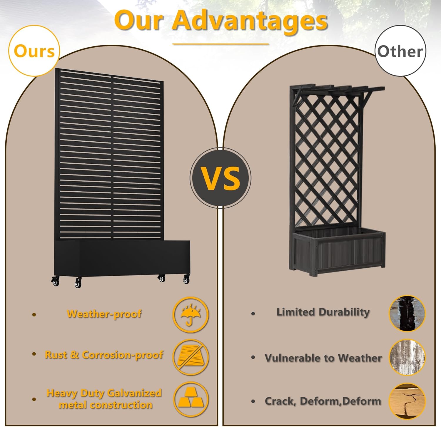 - 【Privacy Screening & Decorative Appeal】This metal planter box with trellis doubles as an elegant privacy screen and decorative fence, ideal for concealing unsightly objects like AC units, pool pumps, or trash cans, and creating natural partitions on decks, patios, and backyards, blending function with outdoor aesthetics.