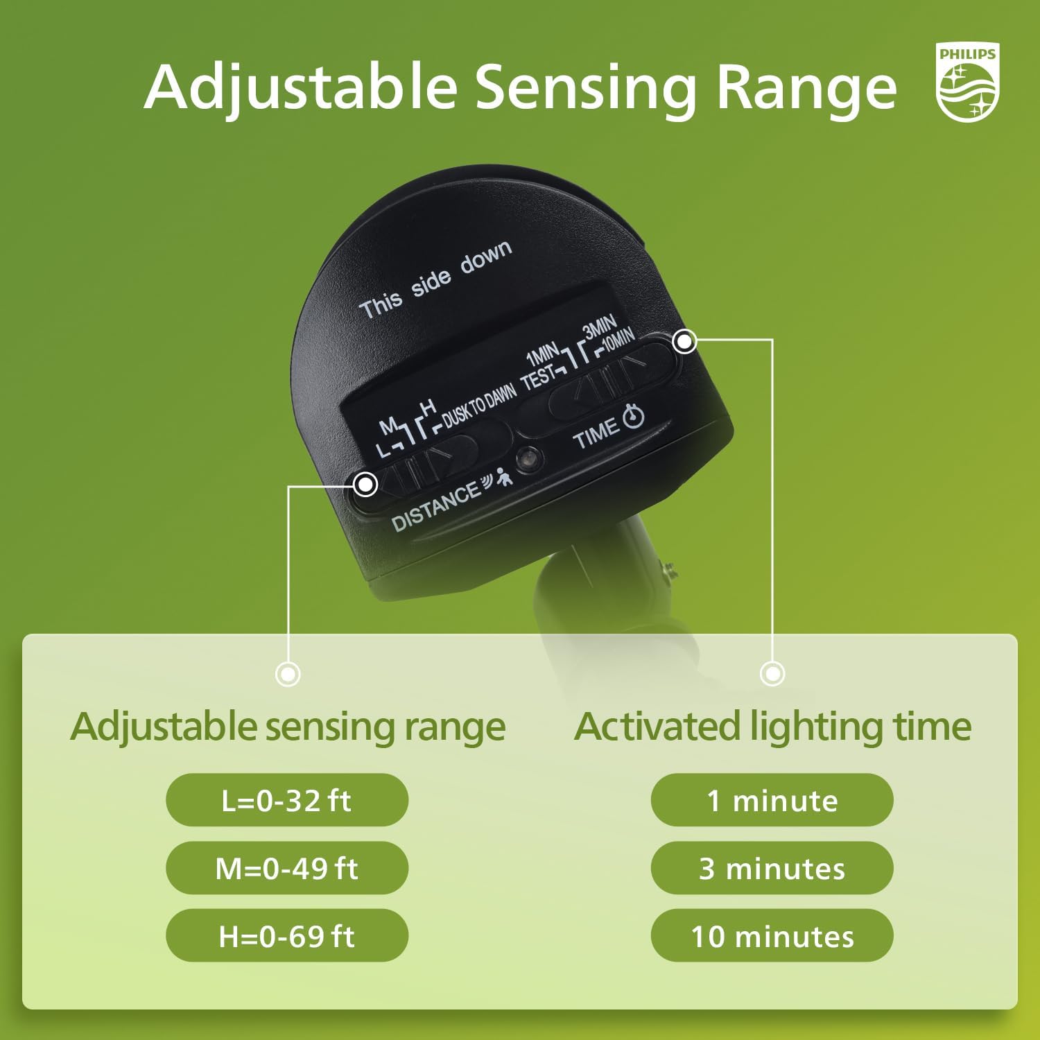 - HIGH-SENSITIVITY MOTION SENSOR - High-sensitivity passive infrared (PIR) motion sensor detects motion up to 69 ft away over a 180° angle; you can set light on time for 1, 3, or 10 mins.