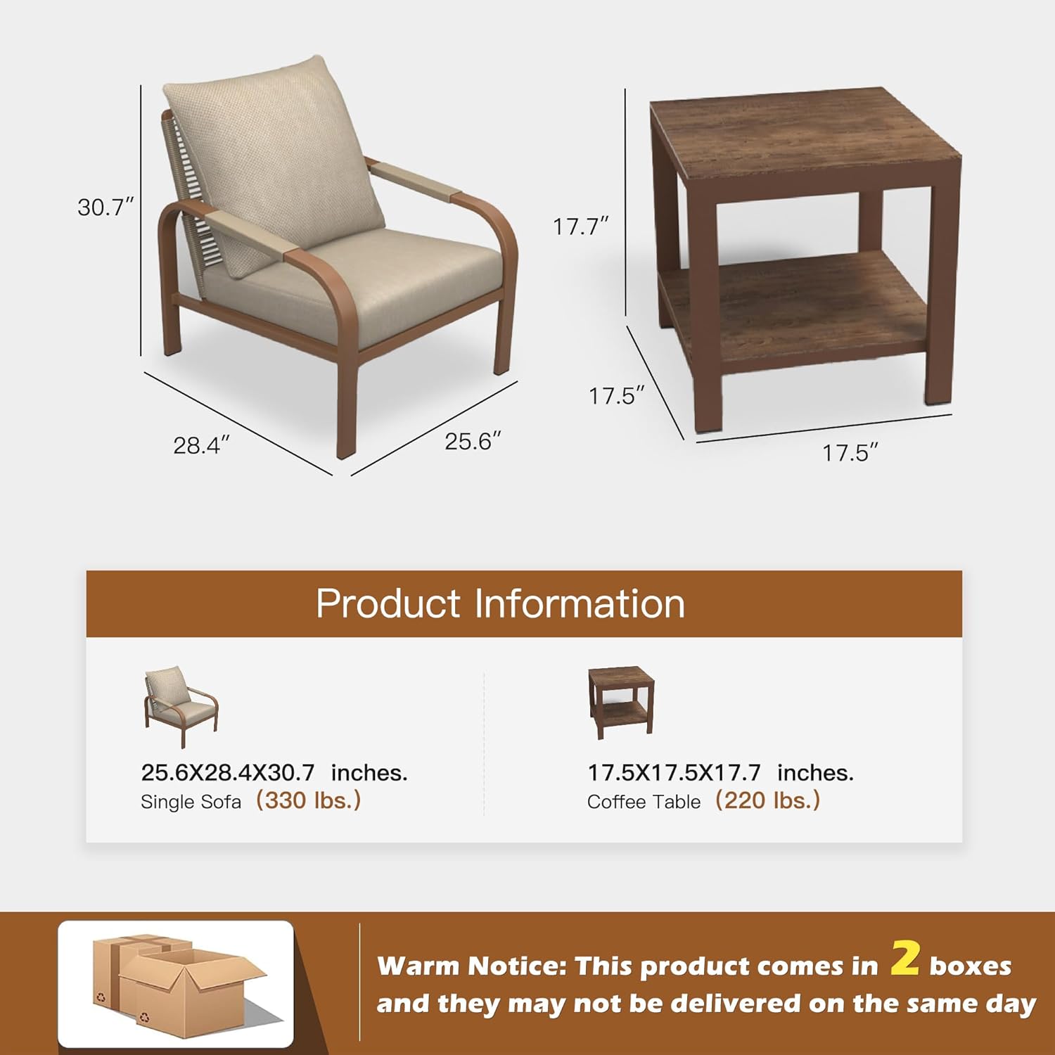 - Easy to Assemble:This patio set is easy to set up. Each part has its own number on installation manual, so you can track assembly progress easily. The set comes delivered in 2 boxes at different times so be patient to wait that please