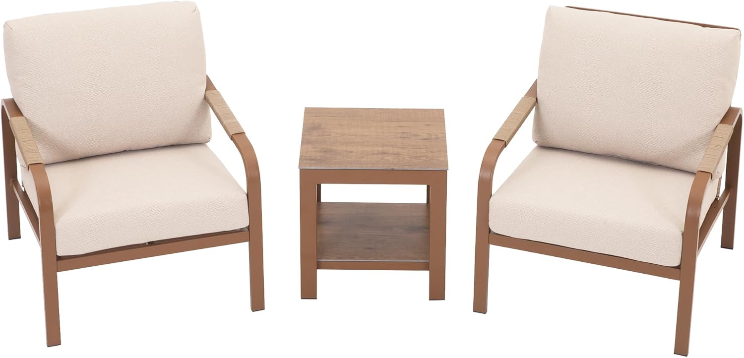 - Enhanced Comfort with Weather-Resistant Fabrics The patio bistro set comes with 4-inch thick high-density foam cushions covered in waterproof, fade-resistant polyester. Ergonomic curved backrests offer natural lumbar support, while Velcro fasteners keep cushions in place. Ideal for gatherings or solo relaxation, it balances softness and support for all-day comfort.
