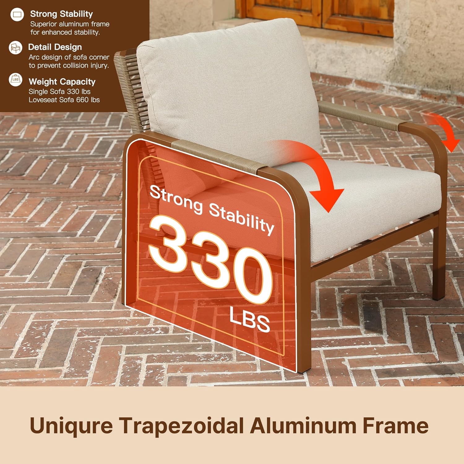 - Premium Durable Materials This patio bistro set features a rust-resistant powder-coated aluminum frame and all-weather PE rattan. It withstands sun, rain, and temperature changes, ensuring year-round durability. Each chair supports 330 lbs, and the coffee table holds 220 lbs. The rattan adds breathable texture, combining strength with modern style for reliable outdoor use.