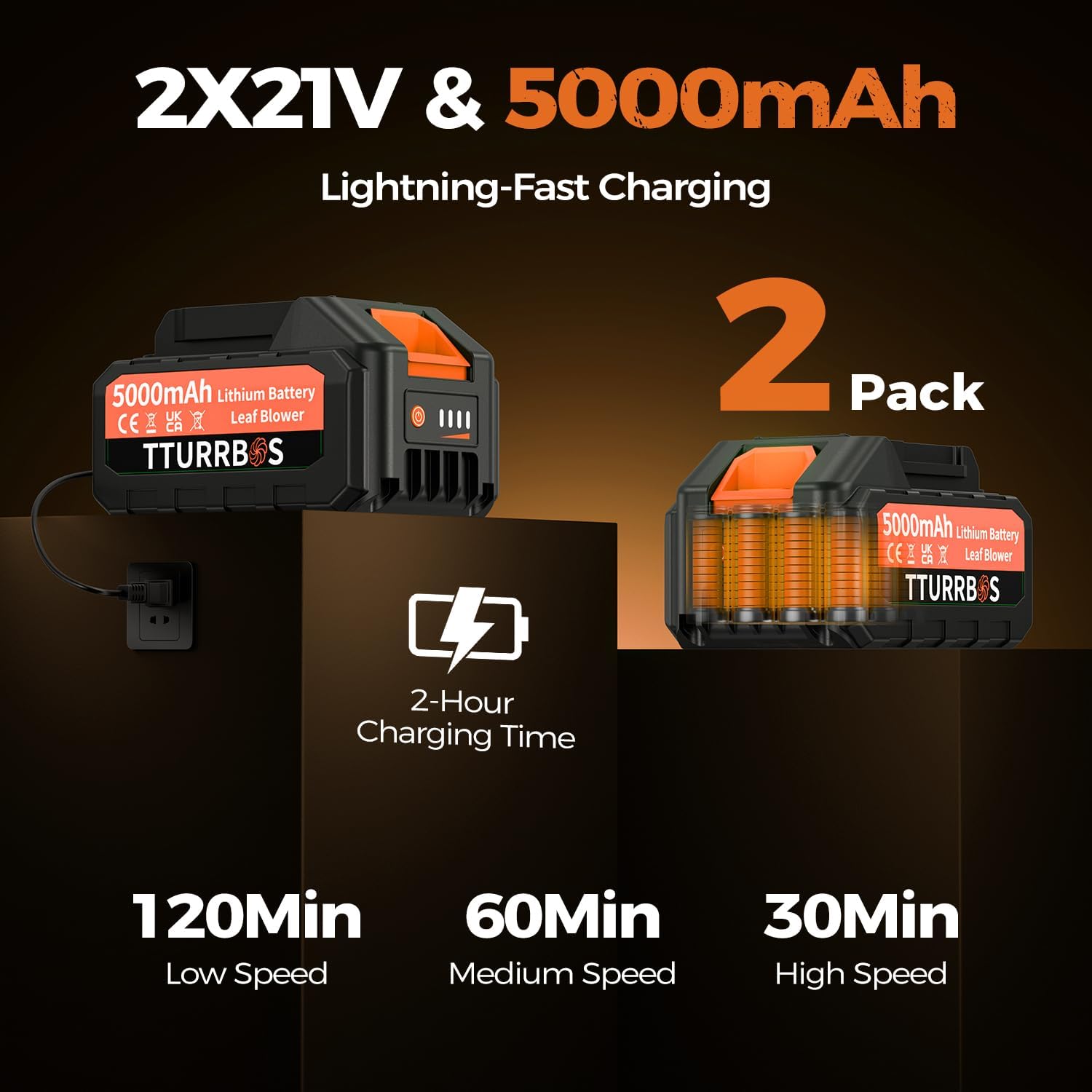 - 【Long-Lasting Power & Fast Charging】Our cordless leaf blower with battery and charger delivers extended runtime and turbo performance. With dual 5.0Ah 21V lithium batteries, it runs for 120 minutes at low speed (30 minutes high speed) and features a 4-stage battery indicator (25%-50%-75%-100%) for real-time tracking. The advanced battery system ensures strong, steady airflow with no power loss, and the included fast charger fully powers your leaf blower in just 2 hours