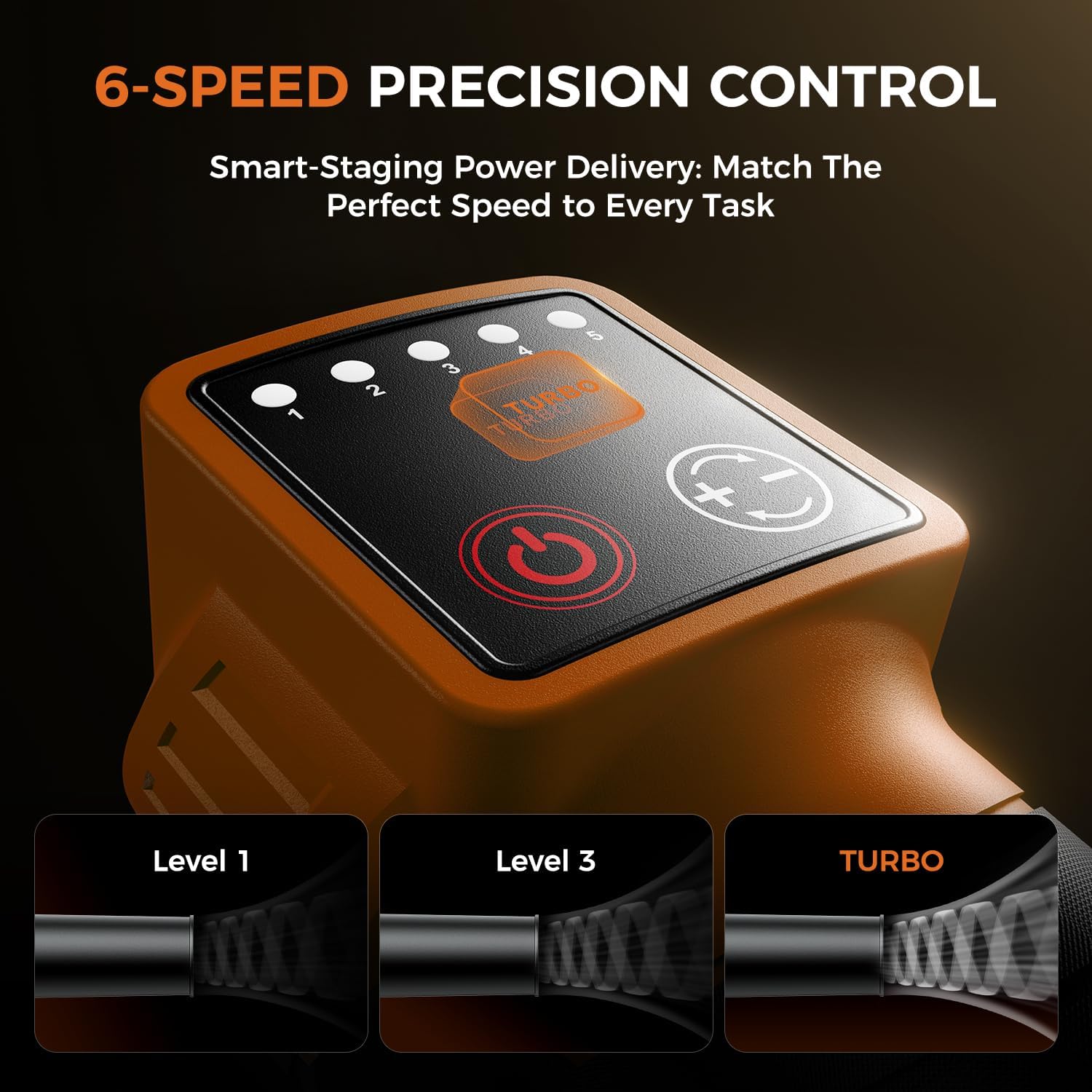 - 【6-Speed Power Settings for Every Task】Master every yard task with our professional leaf blower cordless featuring 6 precision speeds. Five adjustable settings (80-160 MPH) easily handle everything from patio dust to wet leaves, while Turbo mode delivers a powerful 180 MPH for tough debris. The 6-speed system maximizes battery life:lower speeds extend runtime for light work, while Turbo mode provides instant power when needed—giving you complete control over performance and efficiency