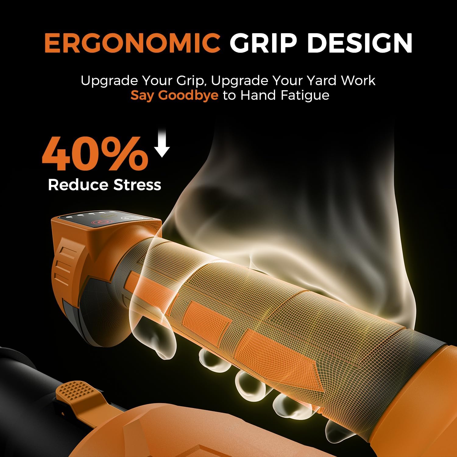 - 【Ergonomic Grip Design—Say Goodbye to Hand Fatigue】Tired of hand fatigue and discomfort while tackling yard work? Our cordless leaf blower is designed with a comfortable, ergonomic grip that reduces strain and vibration. The soft-touch grip provides steady control, even during prolonged use—say goodbye to sore hands! Perfect for homeowners who demand both power and ease of use, these blowers for lawn care help you achieve a pristine yard without the aches