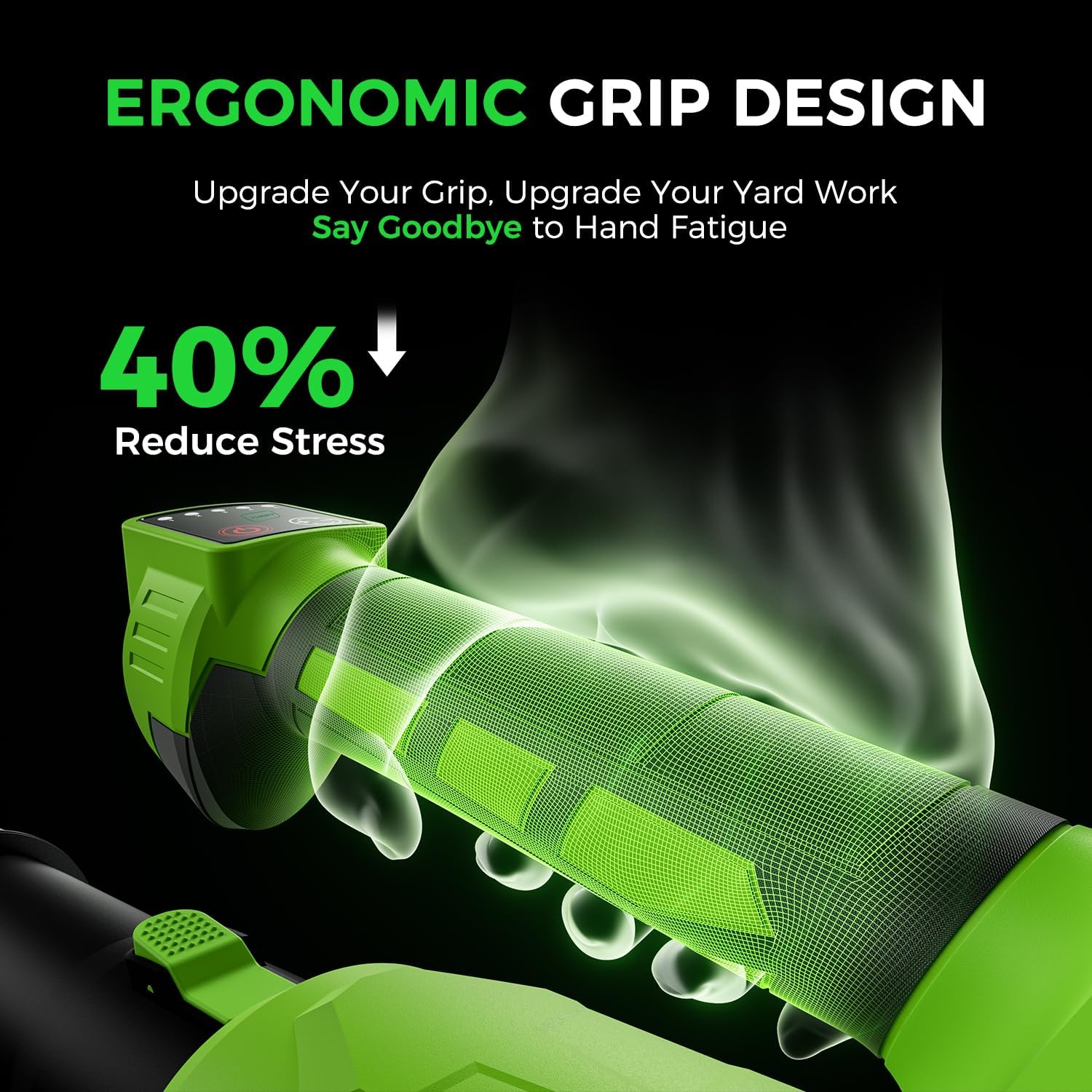 - 🌀【Ergonomic Grip Design—Say Goodbye to Hand Fatigue】Tired of hand fatigue and discomfort while tackling yard work? Our cordless leaf blower is designed with a comfortable, ergonomic grip that reduces strain and vibration. The soft-touch grip provides steady control, even during prolonged use—say goodbye to sore hands! Perfect for homeowners who demand both power and ease of use, these blowers for lawn care help you achieve a pristine yard without the aches